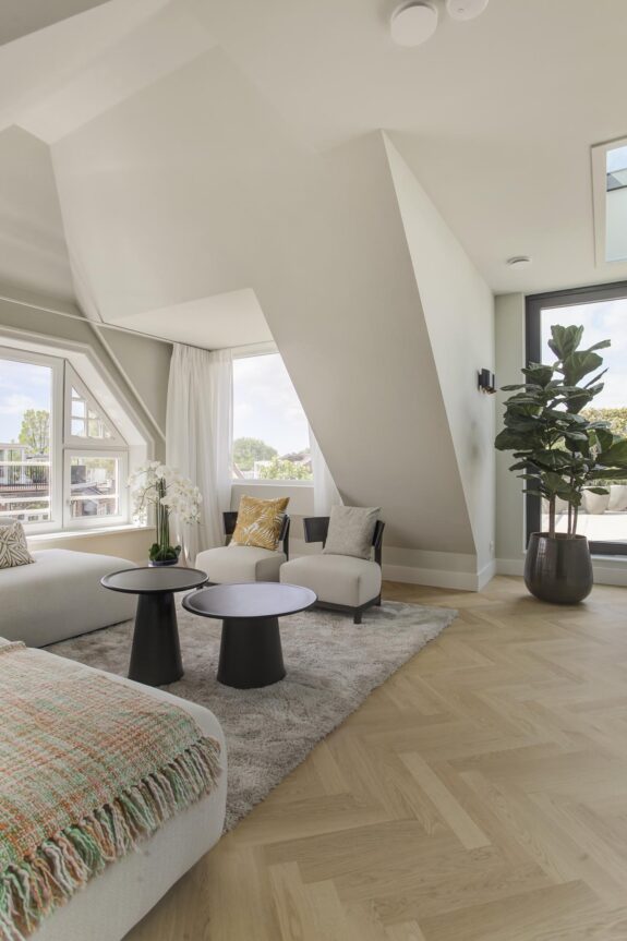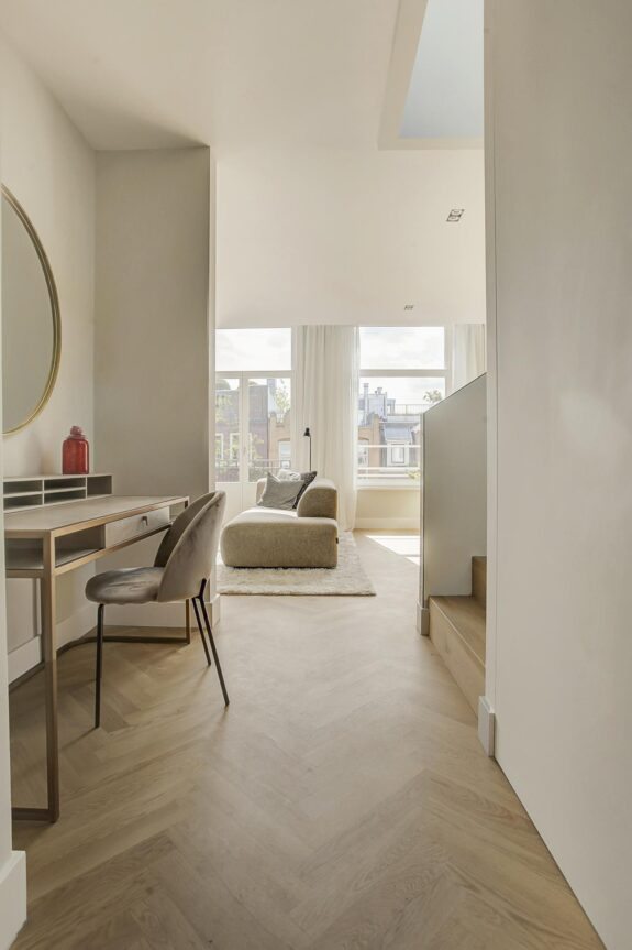 That was the starting point of the renovation of CS 49-51. Thus, much attention was paid to circularity, latest ventilation requirements and air purification. But also on sound insulation, use of heat pump, floor and air cooling. In short, all new techniques have been used to optimise light, peace and space. The penthouse has an energy label A.