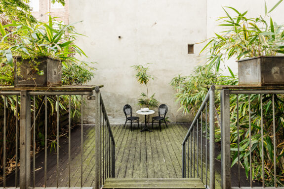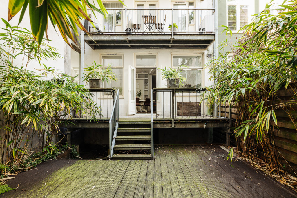De woning op de begane grond heeft aan de keuken openslaande deuren naar de veranda en de tuin. Daarnaast is de voorzijde een heerlijke plek voor een bankje in de middag-en avondzon.