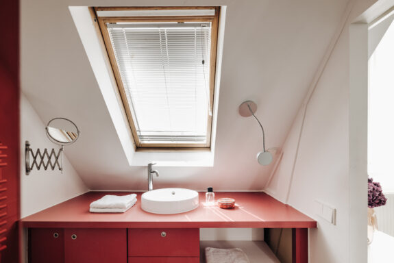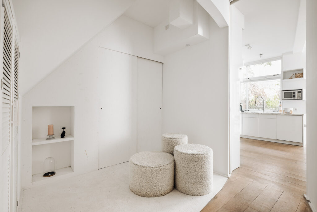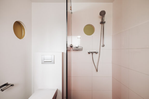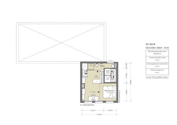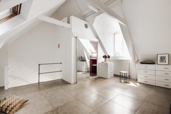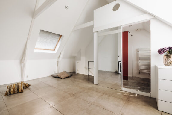 Interne trap naar de slaapverdieping. Er is een fraai ingebouwd bed en maatwerk kasten. De badkamer is voorzien van een inloopdouche, wastafel en toilet.