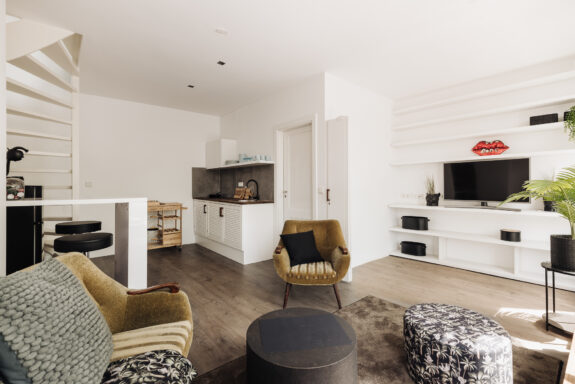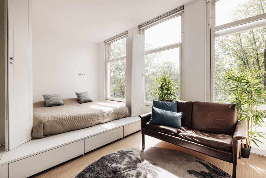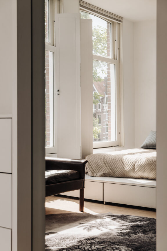 De woning heeft een eigen entree vanaf de tweede verdieping. Er is een gezellige woonkamer met open keuken en drie ramen met zicht naar de grachten.