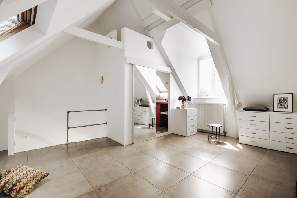 De sfeervolle kapverdieping heeft een mooie hoogte en houten spanten in het zicht. De slaapruimte is voorzien van een badkamer met douche, wastafel en toilet.