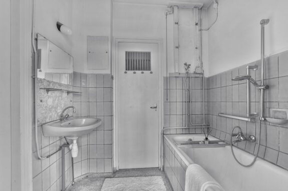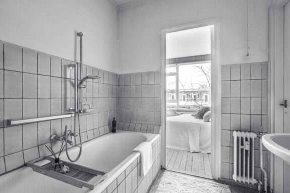 De gemeenschappelijke entree geeft toegang tot dit charmante jaren ‘50 appartement gelegen op de tweede verdieping. De ruime hal geeft toegang tot alle vertrekken. De doorzon woonkamer en suite is als zeer licht te bestempelen door de gunstige zonligging en de grote raampartijen.