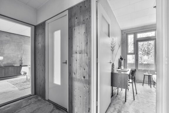 Niet alleen aan de buitenzijde is de simplistische bouwstijl te herkennen. Ook binnen is dit terug te vinden in de manier van vormgeving van onder meer het trappenhuis, bergingen en de indeling van het appartement. Alles is recht voor de optimale benutting van de ruimte.