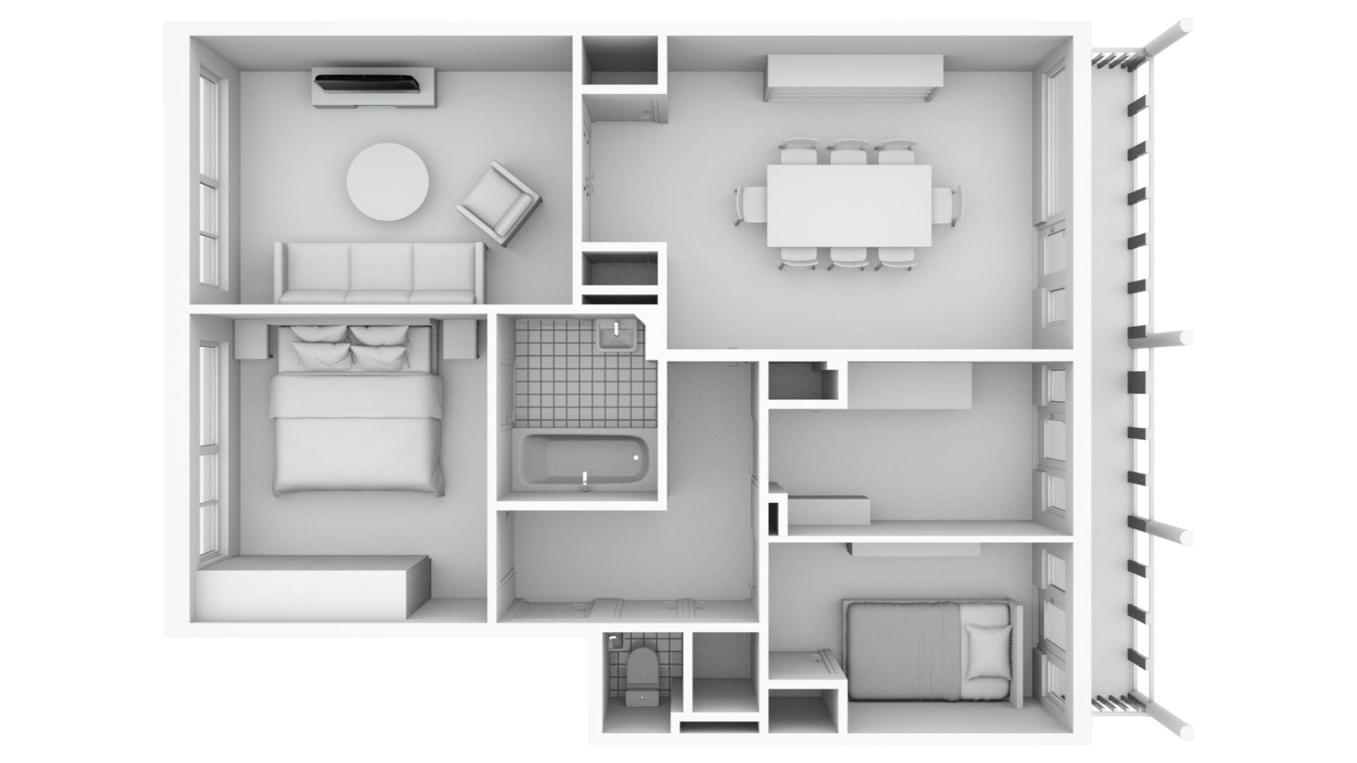 Het appartement heeft twee slaapkamers en de mogelijkheid om een derde slaapkamer te creëren. Via de hal is er toegang tot de badkamer en het separaat toilet.