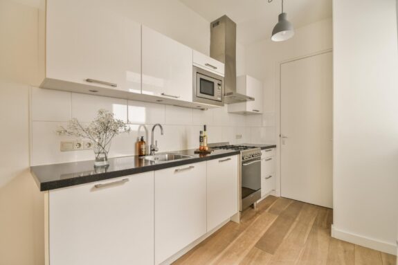 De bergruimte bevindt zich in een vaste wandkast in de keuken. De keuken kijkt uit op de binnenplaats en is voorzien van diverse inbouwapparatuur.