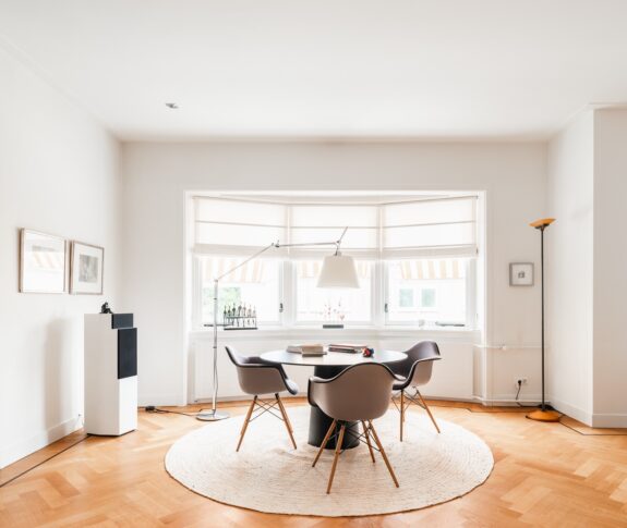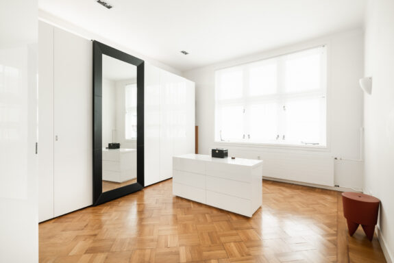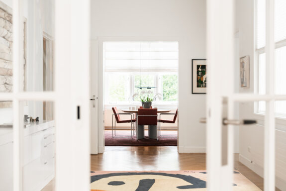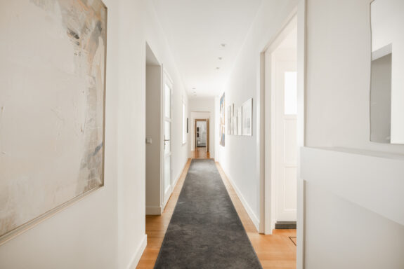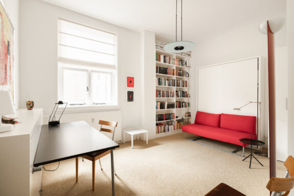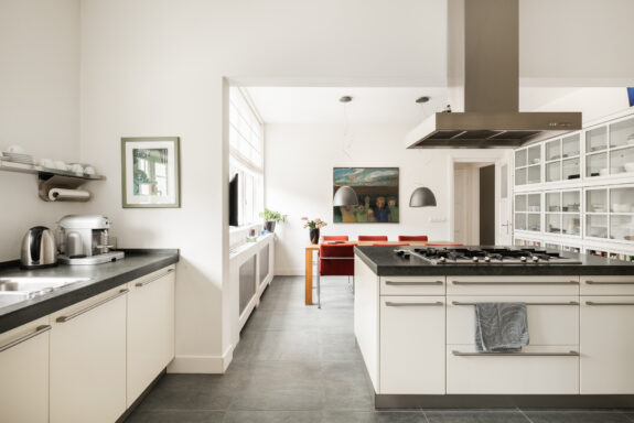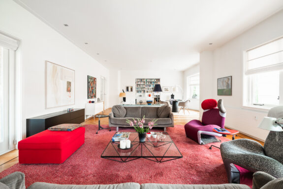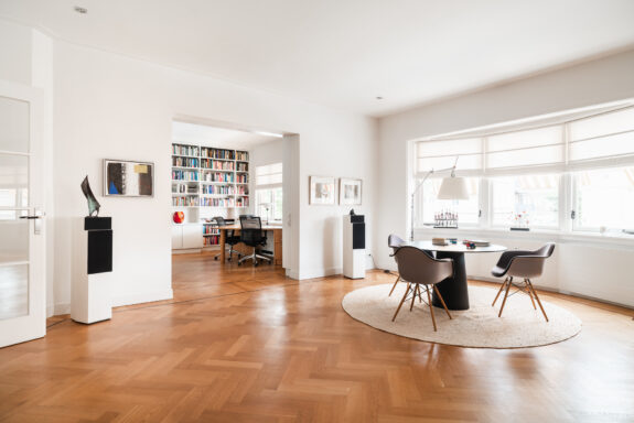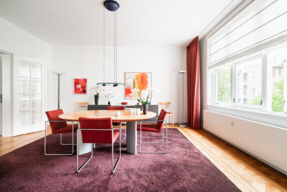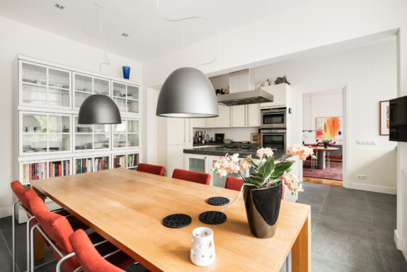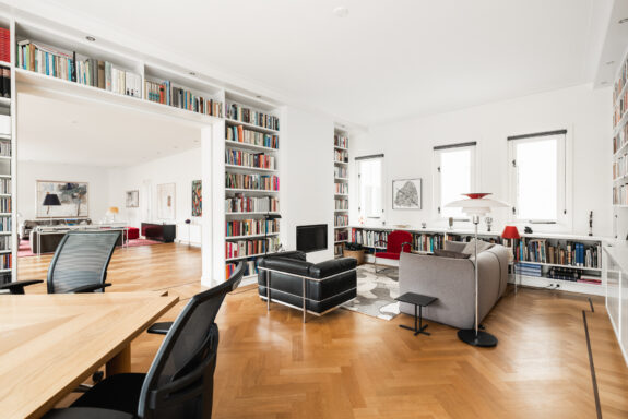 A unique feature of this apartment is the expansive living room of over 60 m², with glazing on three sides, allowing for stunning natural light throughout the day. The living room flows seamlessly into the library, creating an impressive width of more than 16 meters. With its south-facing orientation, the living area is bathed in daylight. The library features custom-built bookshelves, a partner desk, and a charming open fireplace. On the opposite side of the central hallway, the dining room adjoins the spacious kitchen. Designed for both intimate and larger gatherings, the dining room accommodates elegant dinners, while the inviting kitchen offers a more casual setting where the current residents enjoy reading the newspaper at the dining table. The kitchen is finished in a light color palette with a natural stone countertop and is fully equipped with high-end built-in appliances, including a double oven, a five-burner gas stove, a dishwasher, and a fridge-freezer combination.