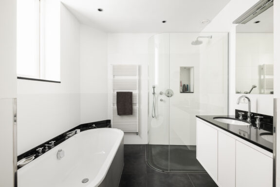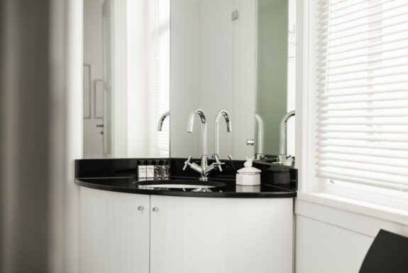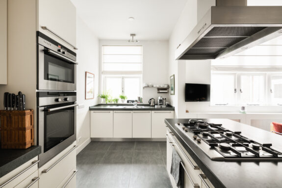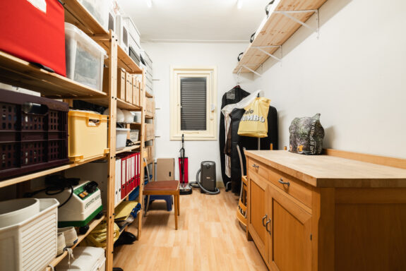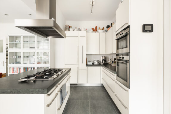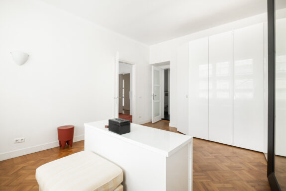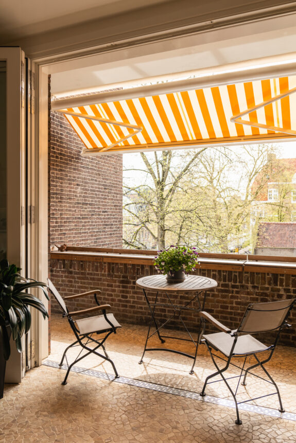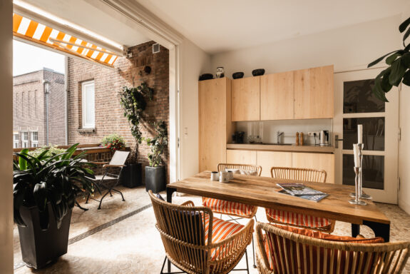 The west-facing balcony with an adjoining atelier/loggia serves as a seamless extension of the living space. With a fully retractable glass sliding wall, the loggia provides a sheltered retreat to enjoy the afternoon and evening sun. The integrated kitchenette (cuisine d’été) makes this space ideal for summer dining. During the warmer months, the spacious balcony and adjoining loggia offer a perfect setting to relax, basking in sunlight for much of the day. From here, there is a picturesque view of the manicured garden of the Dufayhuis—a lush oasis that ensures both tranquility and privacy.