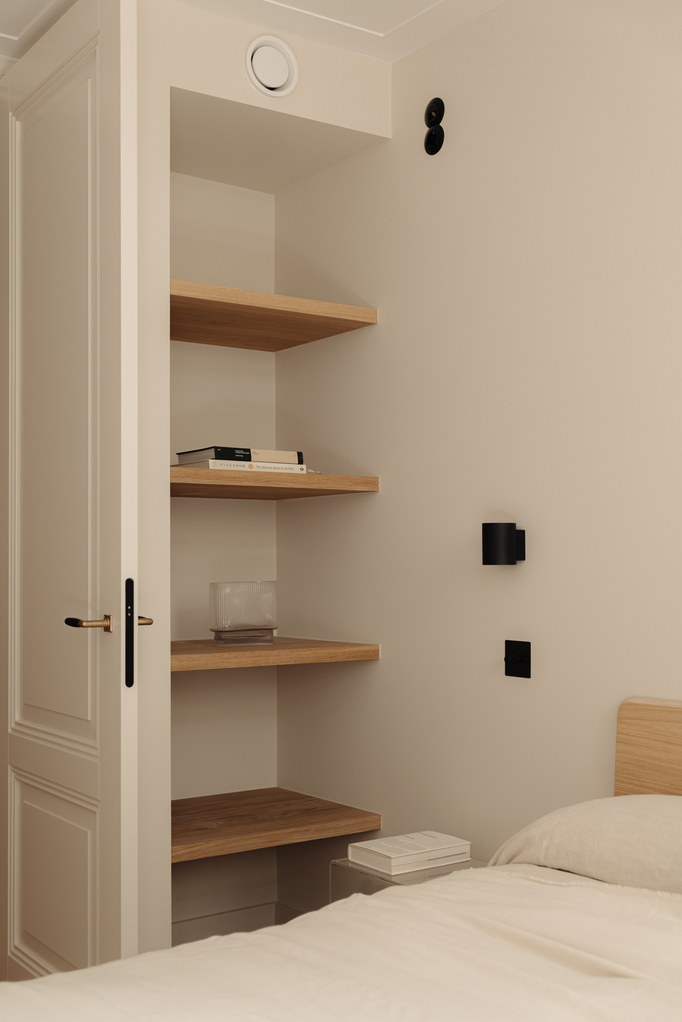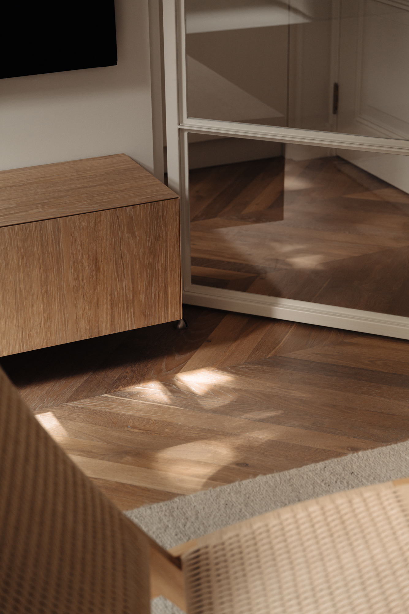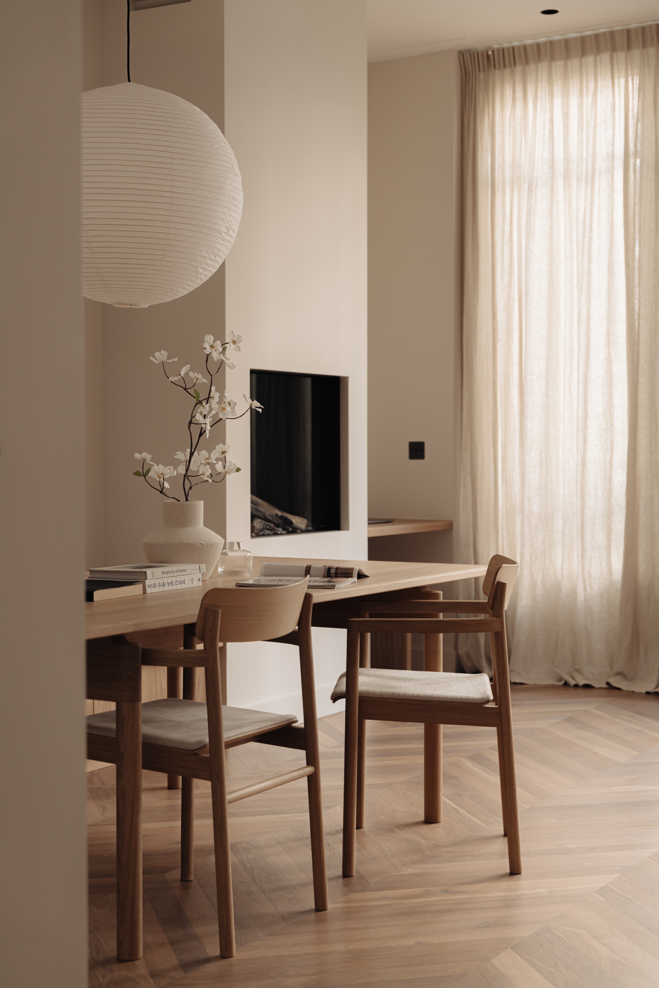 "The 120-year-old building was completely transformed by Rock Real Estate, achieving timelessness while preserving or restoring original details such as the original exterior doors, windows, and facade. This, coupled with the open spaces and optimal layout on both the ground floor and in the basement, ensures that every interior design shines at its best; in our case, our fondness for Japandi. A fusion of Japanese and Scandinavian styles: simplicity, comfort, and well-being."