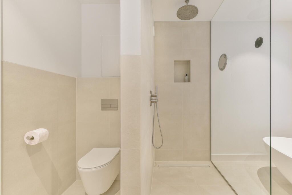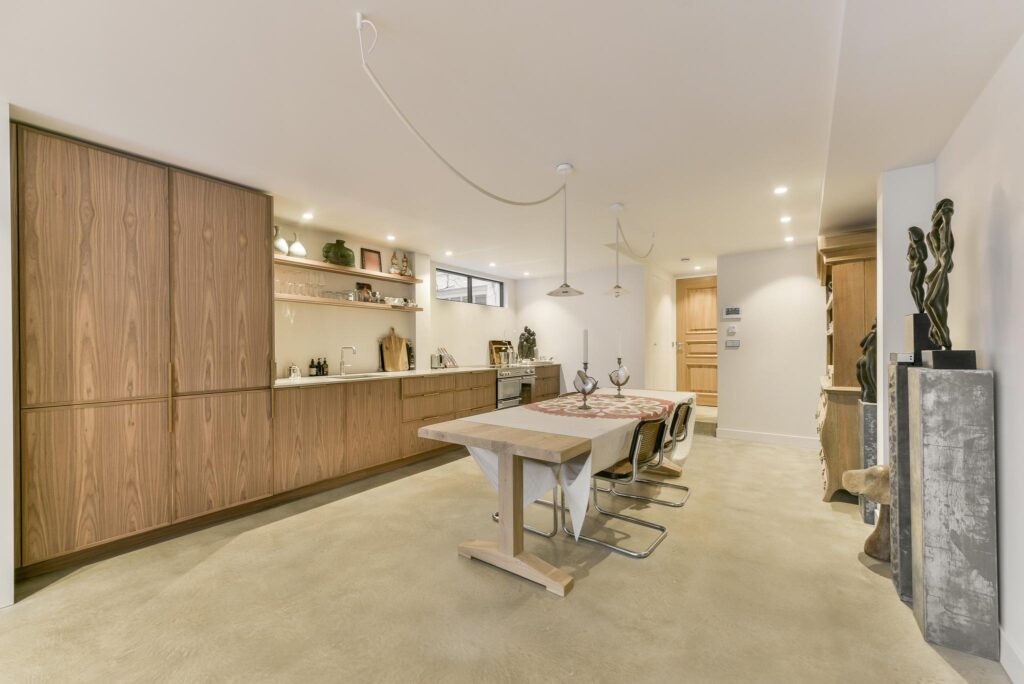 Entering through the communal hall, the living room with modern open kitchen at the rear immediately appeals to the imagination. The custom kitchen is equipped with various built-in appliances and the room gives a spacious and open feeling. Accessible through the two double doors in the terrace, located on the southwest. There is a separate toilet in the hall. The entire apartment is heated by underfloor heating.