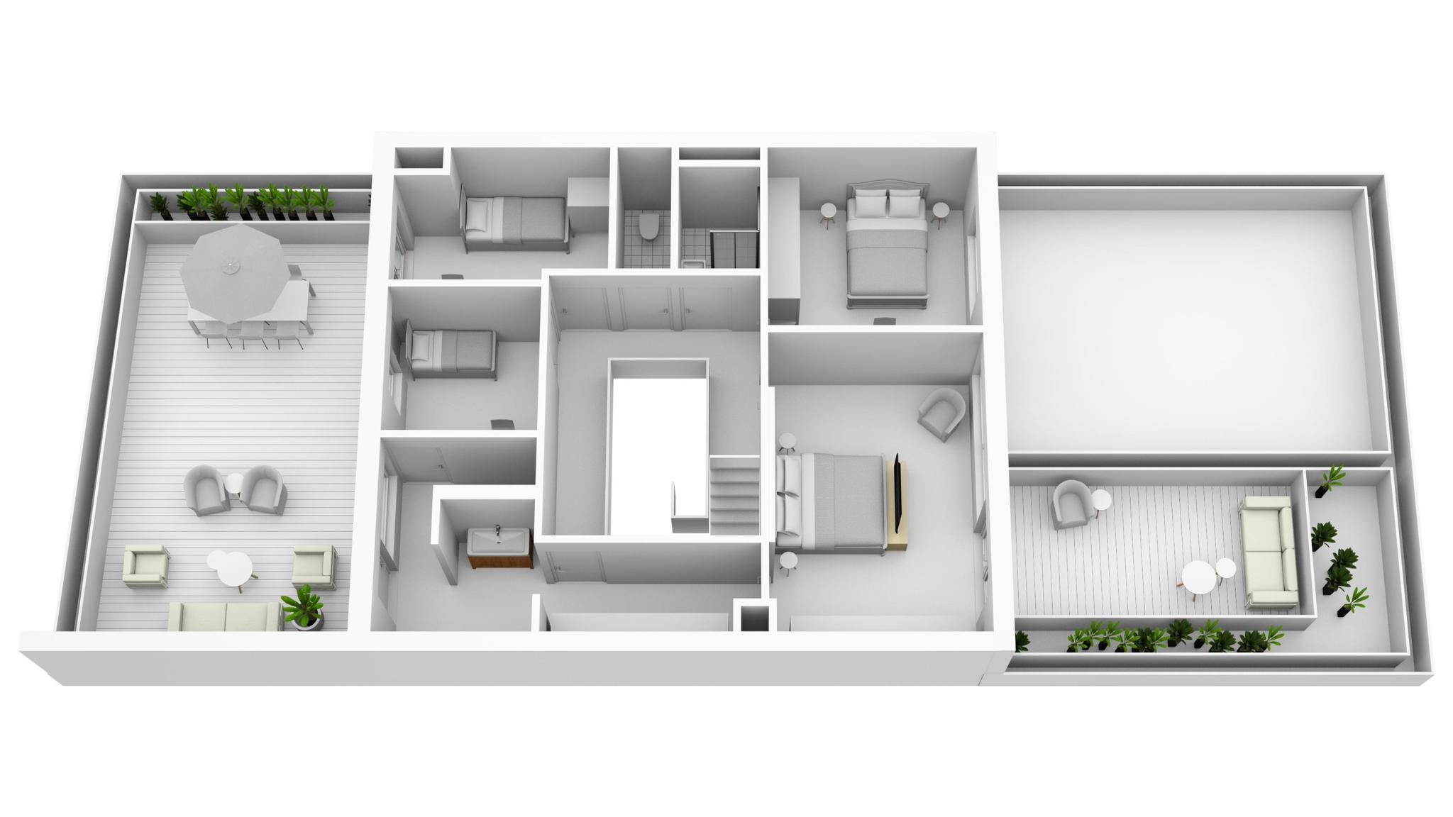 The most striking, and most comfortable, feature of this level is the central stairwell and its surrounding gallery. Ensuring that despite the size of the house, it is still an inviting space that encourages interaction. The gallery accesses four bedrooms. The owners' suite consists of a spacious bedroom with a connecting dressing room that, in turn, leads through to a bright, beautiful bathroom. The other three bedrooms are ideal children's bedrooms or can be appointed as an extra study. These rooms share a second bathroom and a separate restroom. At both the front and the rear, there are two large roof decks.