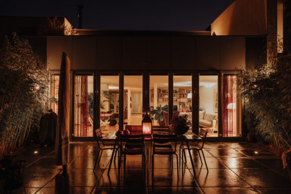 At the front, the outdoor space consists of a terrace that is used both for parking as a spot to enjoy the sunshine. This is also where you will find the front door of the house.