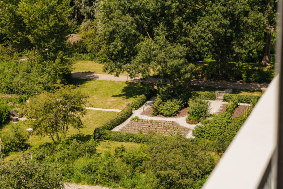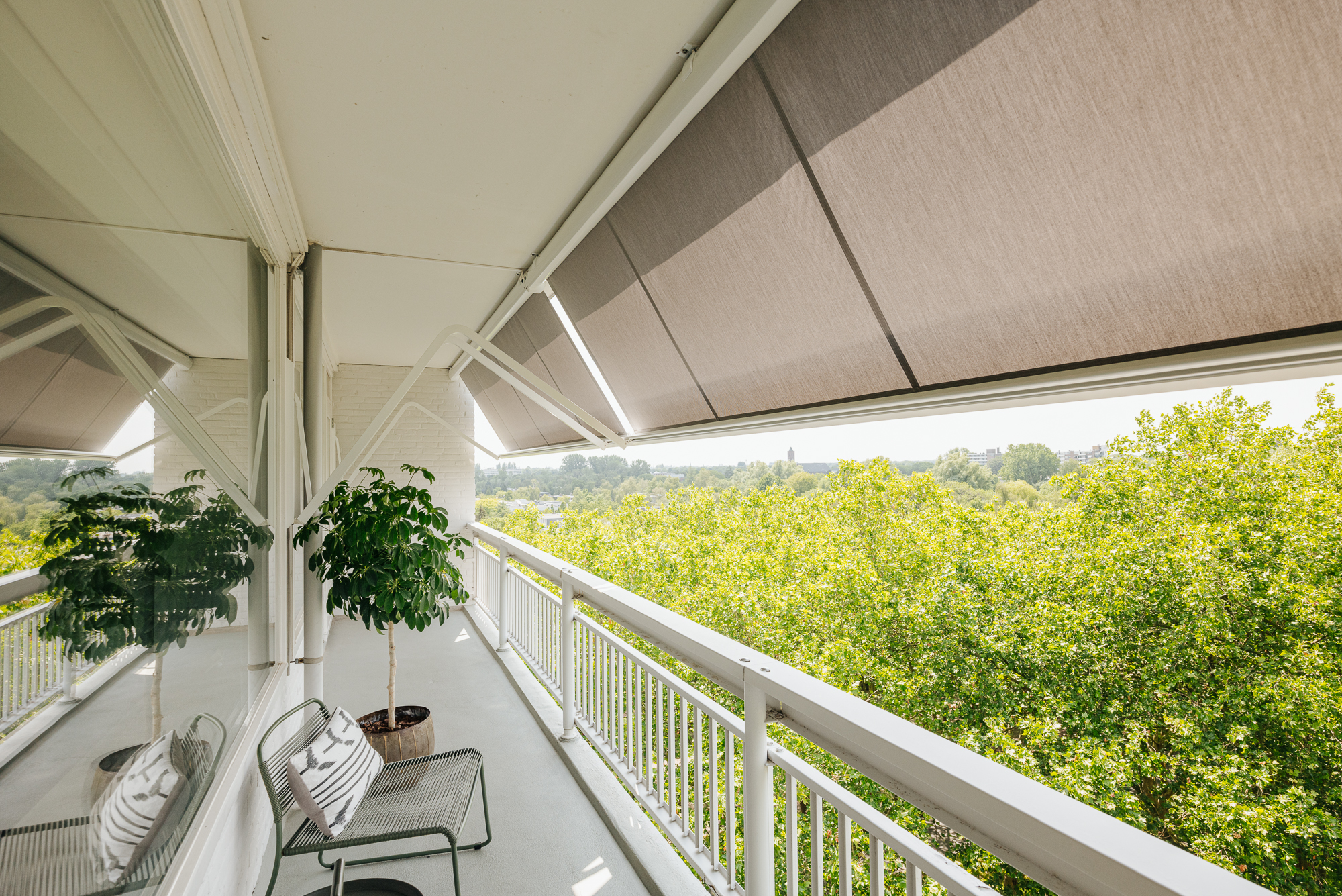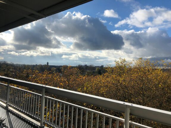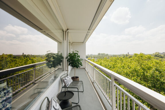 Royaal balkon van circa 12 m² over de gehele breedte van de woning met weids uitzicht over het groen. Het balkon geniet van een zonnige ligging op het westen. Ideaal voor een kopje koffie in de middagzon of om te genieten van een goed glas wijn in de avond na een lange dag op kantoor.