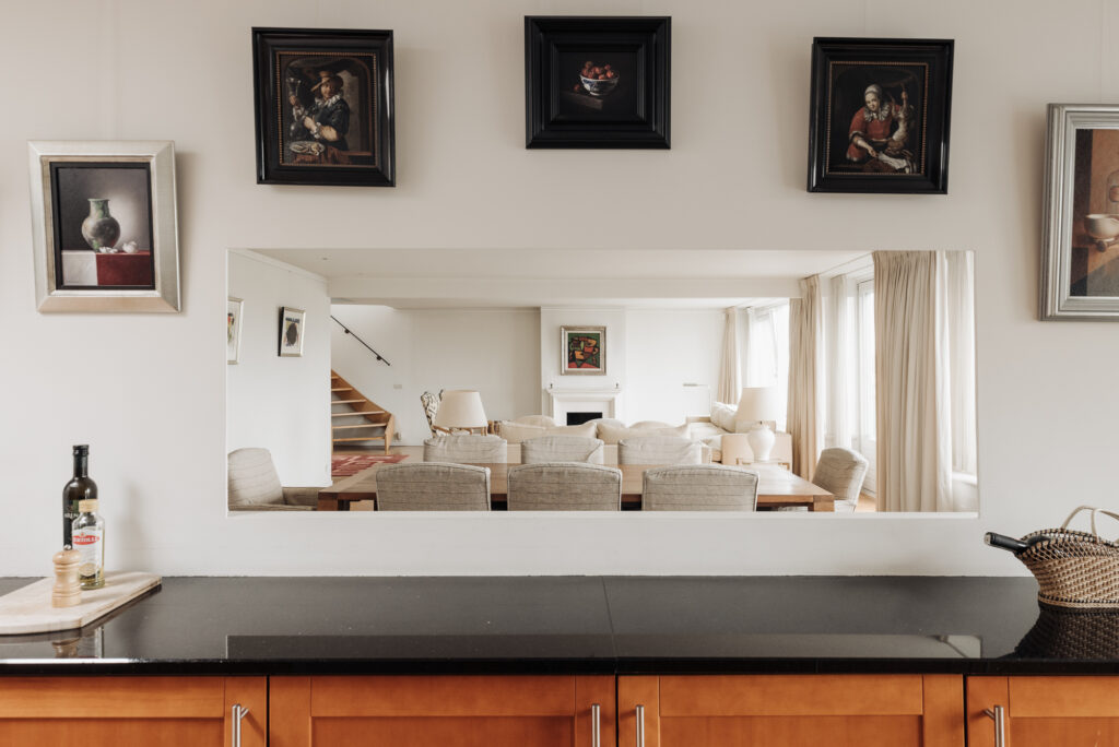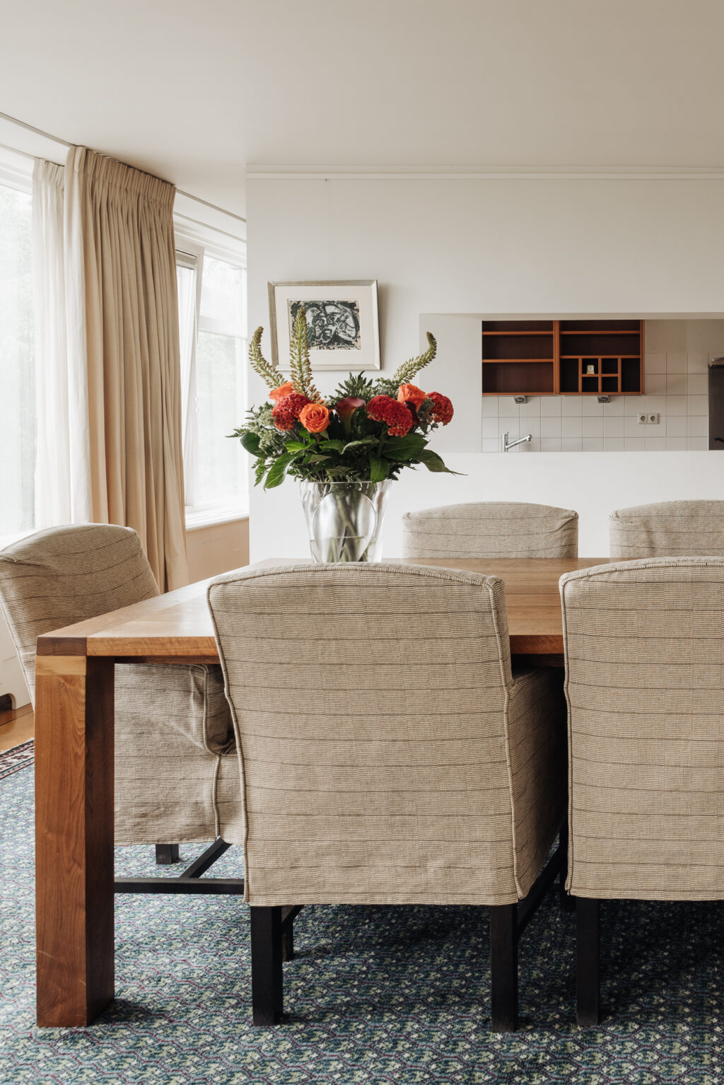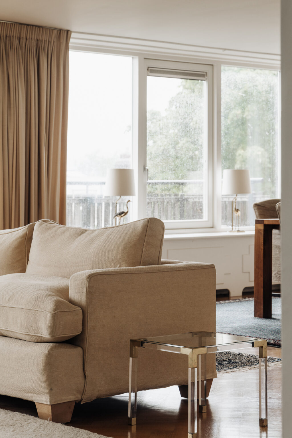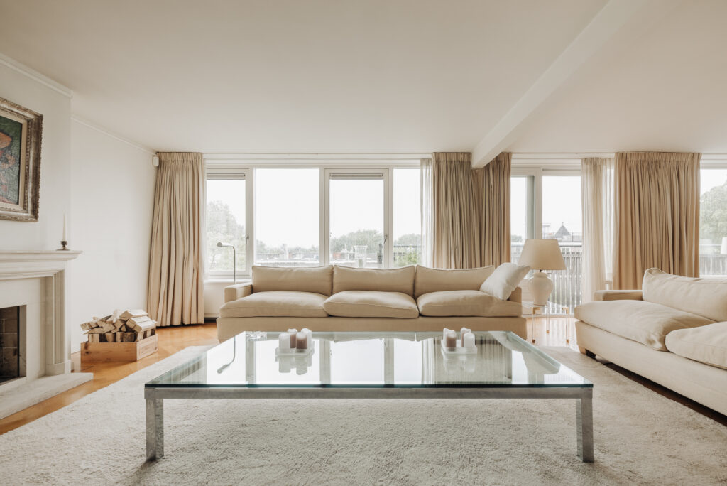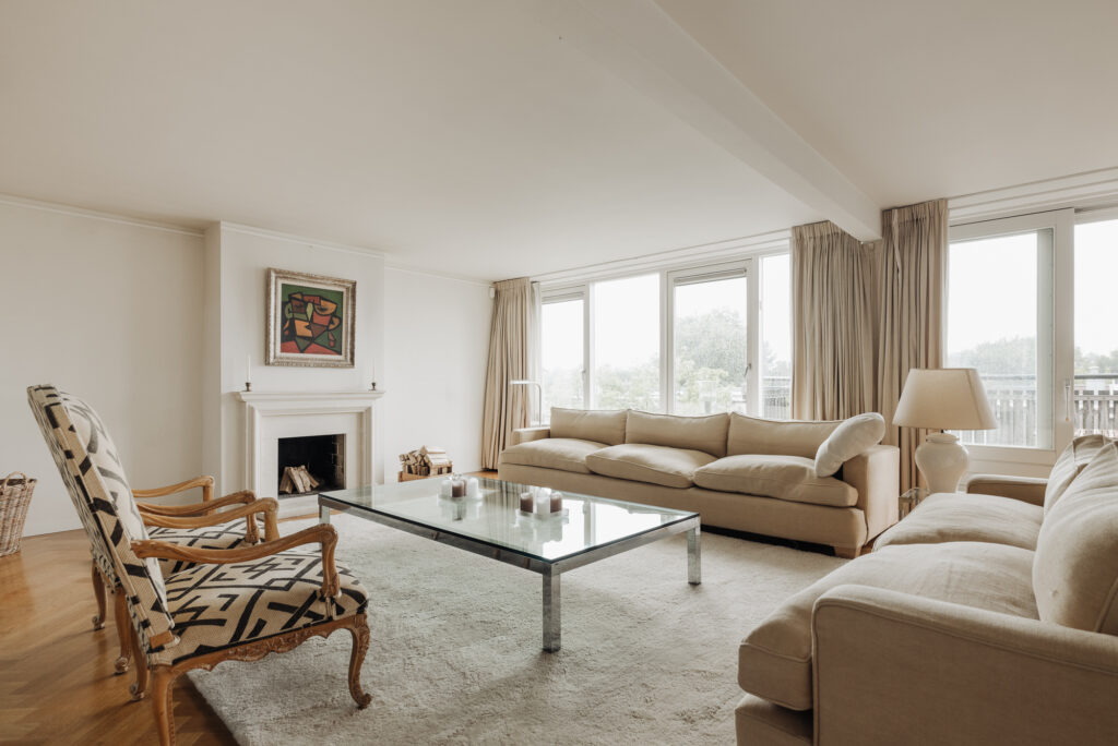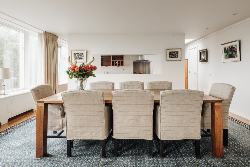 De woonkamer heeft een breedte van circa 14 meter en het vele glas zorgt voor extra licht. Er is meer dan genoeg ruimte voor een zit- als eetgedeelte.
