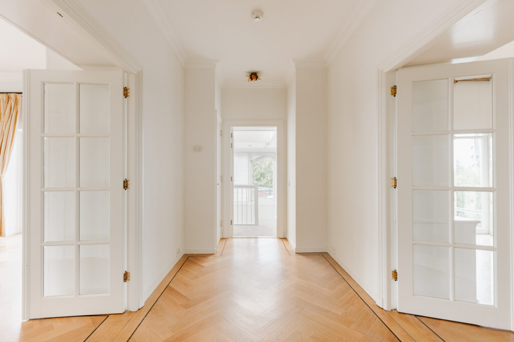 Gemeenschappelijk entree met lift en trappenhuis. Entree op vierde verdieping in ruime hal met gastentoilet en garderobe. Aan de parkzijde is de ruime living met uitzicht over het Vondelpark. De ruimte is prettig licht door de hoge plafonds (meer dan 3 meter) en heeft via de dubbele deuren uitloop naar het terras. Het woonvetrek heeft veel ingebouwde kasten, een gas openhaard en vanuit de vensterbanken is fraai zicht op het park. Aan de achterzijde is de woonkeuken met aansluitend een balkon op het zuiden en het dakterras. De woonkeuken biedt plek aan een grote eettafel en een ruime keuken.