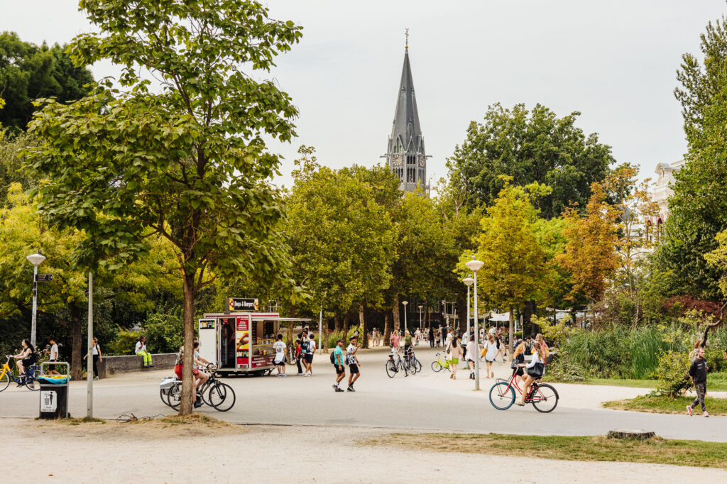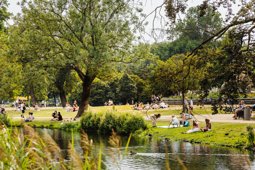 Het dakterras is geheel vrij aan het het park gelegen en heeft vrij zicht over het groen en de vijvers. Door de vrije ligging is er volop privacy en zon.