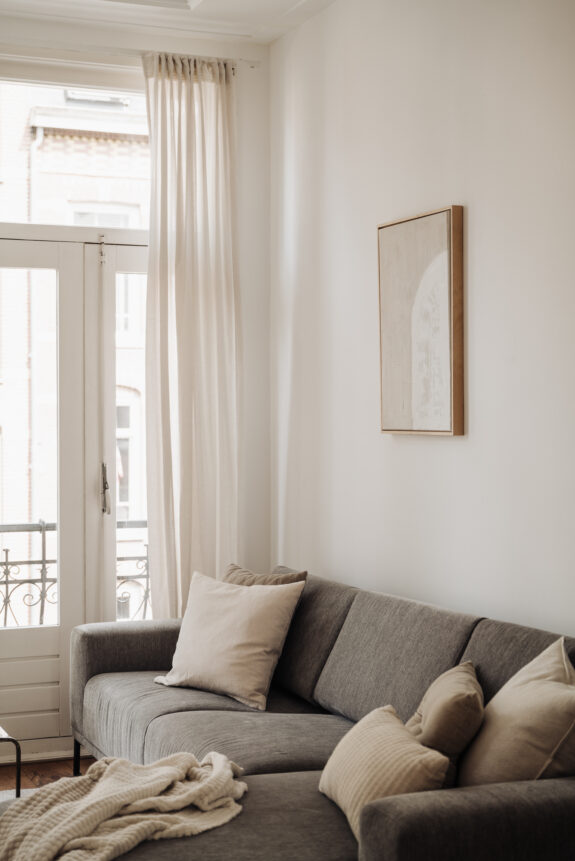 Communal entrance with a stairwell to the second floor. Bright living space with pocket doors and a ceiling height of 2.93 meters. The inviting living room is at the front and features French doors to a Juliette balcony. The dining and living room are separated by means of the original pocket doors and side cabinets. The dining room has an open connection to the kitchen and features French doors to a spacious and sunny balcony. The contemporary kitchen is equipped with a range of appliances and a beautiful Smeg refrigerator. The bedroom is at the front and is fitted with a closet. The bathroom includes a shower, sink and a toilet.