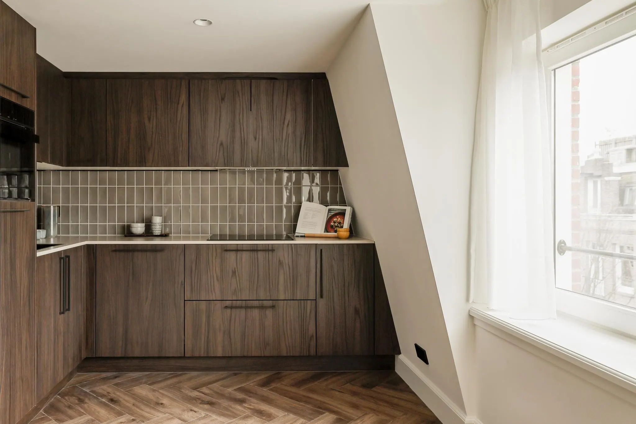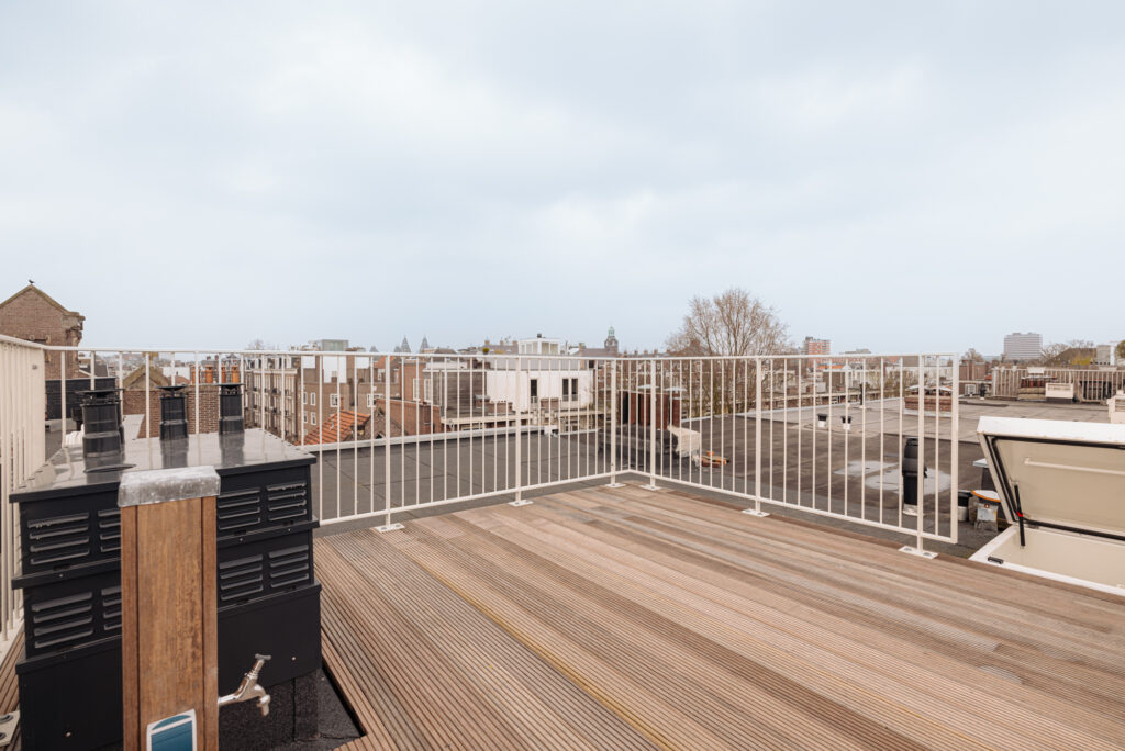 Bij binnenkomst vanuit het trappenhuis betreed je de woonkamer met sfeervolle dakramen die zorgen voor een unieke ambiance. De woonkamer heeft een eethoek en een comfortabele zithoek. De open hoekkeuken is uitgevoerd in donker notenhout en heeft een vierpits kookplaat, een oven-magnetron en apparatuur van Siemens, een Quooker en een koelkast.In de hoek van de woonkamer is een gezellige zithoek gecreëerd. Aangrenzend aan de woonkamer bevindt zich een eethoek. De grote slaapkamer heeft op maat gemaakte kasten die voldoende opbergruimte bieden voor al je kleding en persoonlijke bezittingen. De tweede slaapkamer bevindt zich ook aan de achterzijde van de woning. De badkamer is prachtig afgewerkt met hoogwaardige materialen en tegels en beschikt over een inloopdouche en luxe wastafel. De woning heeft een separaat toilet. Via een vaste trap is het dakterras te bereiken, met prachtig uitzicht over Duivelseiland. In de hele woning ligt een pvc-vloer, wat zorgt voor een moderne uitstraling en makkelijk te onderhouden is. Dit appartement wordt niet gemeubileerd opgeleverd.