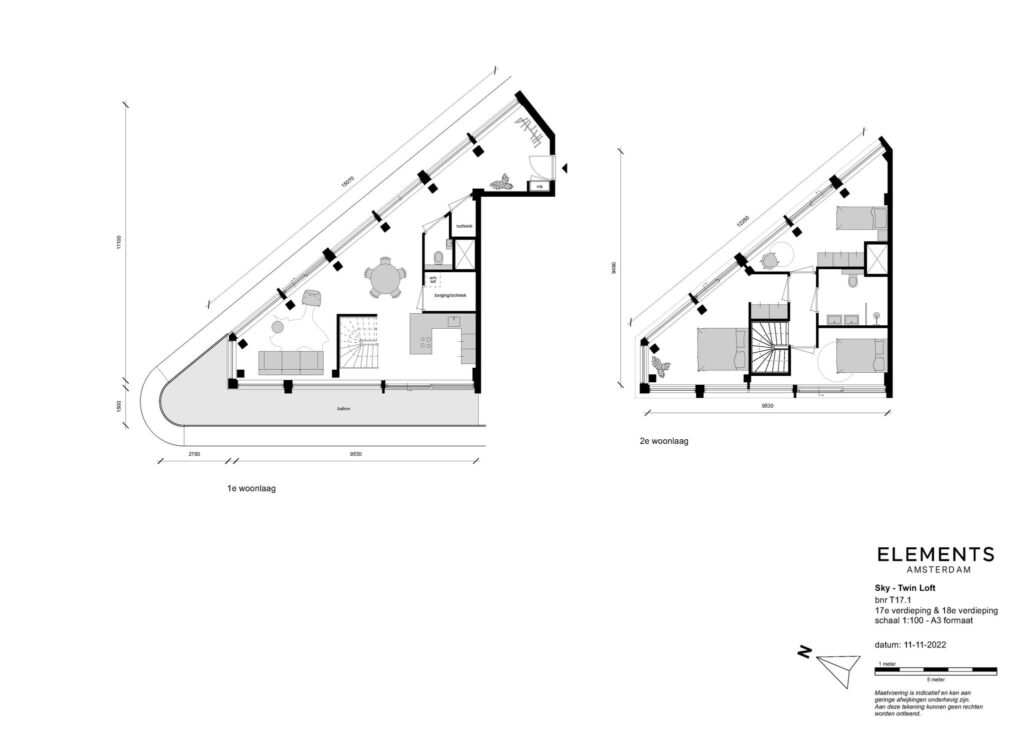 Deze royale Sky Twin Loft ligt op de 17e en 18e verdieping van Elements en heeft een geweldige ligging in de punt van het gebouw. De Sky Twin loft is voorzien van alle gemakken en heeft 3 slaapkamers. Grote raampartijen in de living laten het daglicht schitteren in de woning. Hier beleef je het uitzicht op de Amstel en de skyline van Amsterdam, dat ieder moment van de dag weer anders is. Geniet de hele dag van de zon, of je nu in de ochtend een koffietje drinkt of een borrel drinkt op het balkon.