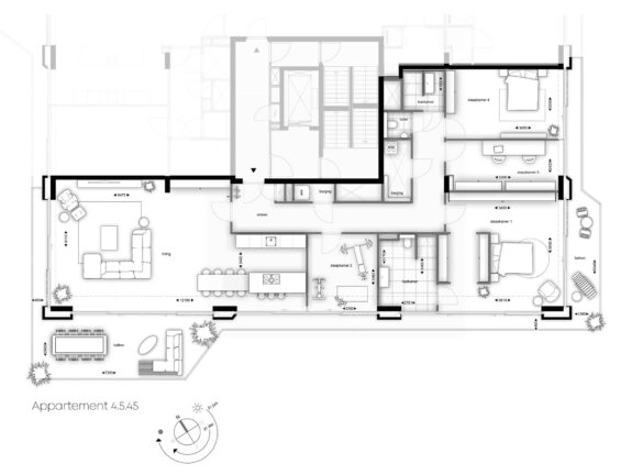 De hele voorzijde van de vijfde verdieping is voor Blanc 4.5.45. Dat betekent licht, ruimte en IJ-zicht in deze woning van ca. 198 m2. De living in de zuid westhoek van het gebouw is 12 meter breed.  Vanaf het ruime terras op het zuiden dat aan de living grenst, geniet u van de mooiste uitzichten (totale buitenruimte  ca. 55 m2). Ook de master bedroom is heel ruimtelijk ingedeeld met een inloopkast, een aangrenzende badruimte en een eigen terras. De woning heeft nog drie (slaap)kamers en een extra badkamer. De indeling van het appartement kan in overleg naar uw wensen worden aangepast.