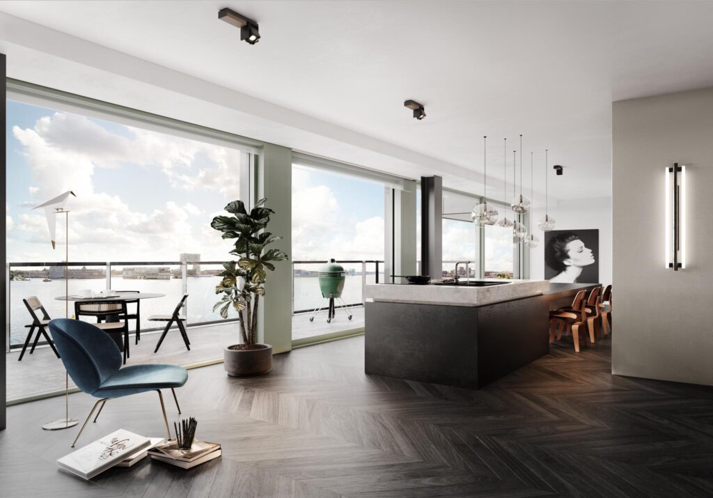 Powerhouse Company heeft Coast ontworpen. De geveldetails van Coast in zwart aluminium wisselen mooi af met de grote raampartijen. De uitzichtpanorama’s zijn hier straks ongekend. “Aan de straatkant is het gebouw vooral gericht op privacy en aan de IJ-zijde staat het gebouw als het ware open”, Paul Stavert, architect Powerhouse Company.