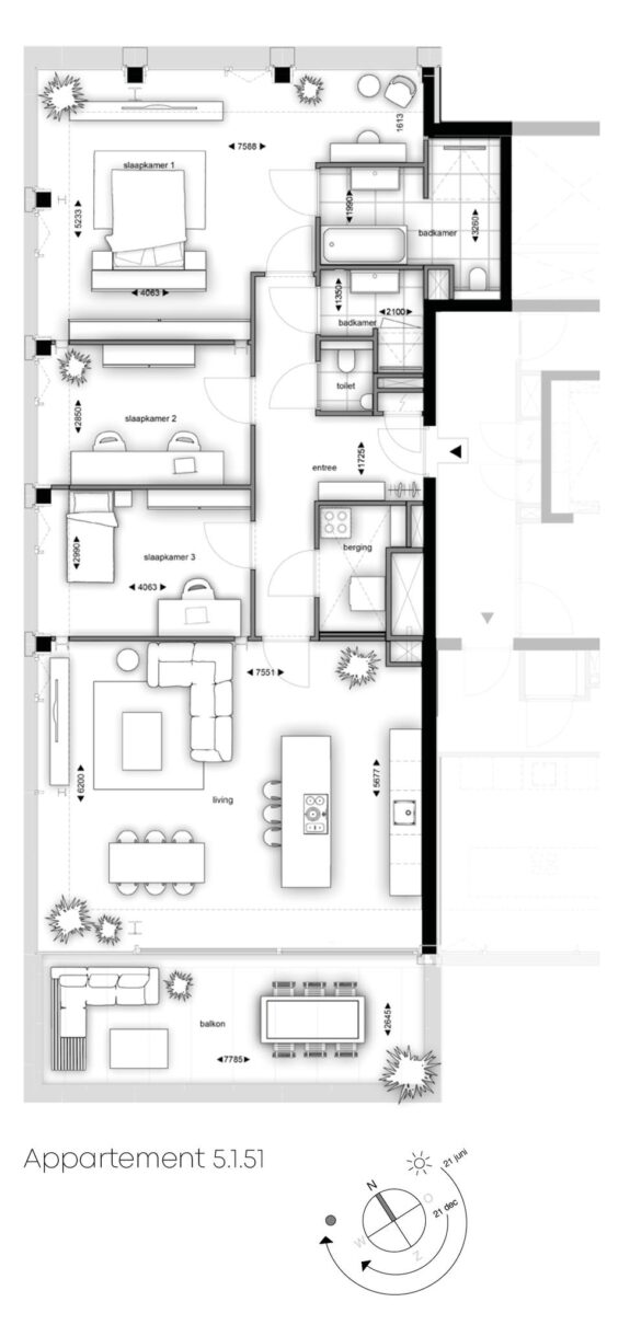 Op de eerste verdieping van Verde komt appartement 5.1.51. De woning heeft een woonoppervlakte van ca. 144 m2 en het aangrenzende terras (ca. 20 m2) ligt op het zuiden. Vanuit de living en het terras heb je zicht richting het IJ. De woning heeft drie slaapkamers en twee badkamers.