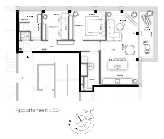 Appartement 5.2.54 is met zijn 88 m2 aan woonoppervlakte slim ingedeeld. De grote raampartijen dragen bij aan het ruimtelijke gevoel. In deze woning op de tweede verdieping heb je de beschikking over een ruime living en twee slaapkamers. Vanuit de woonkamer en het aangrenzende terras van ca. 8 m2 heb je een zichtlijn over het IJ.