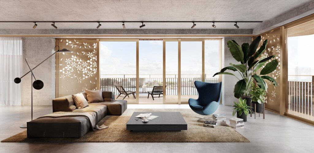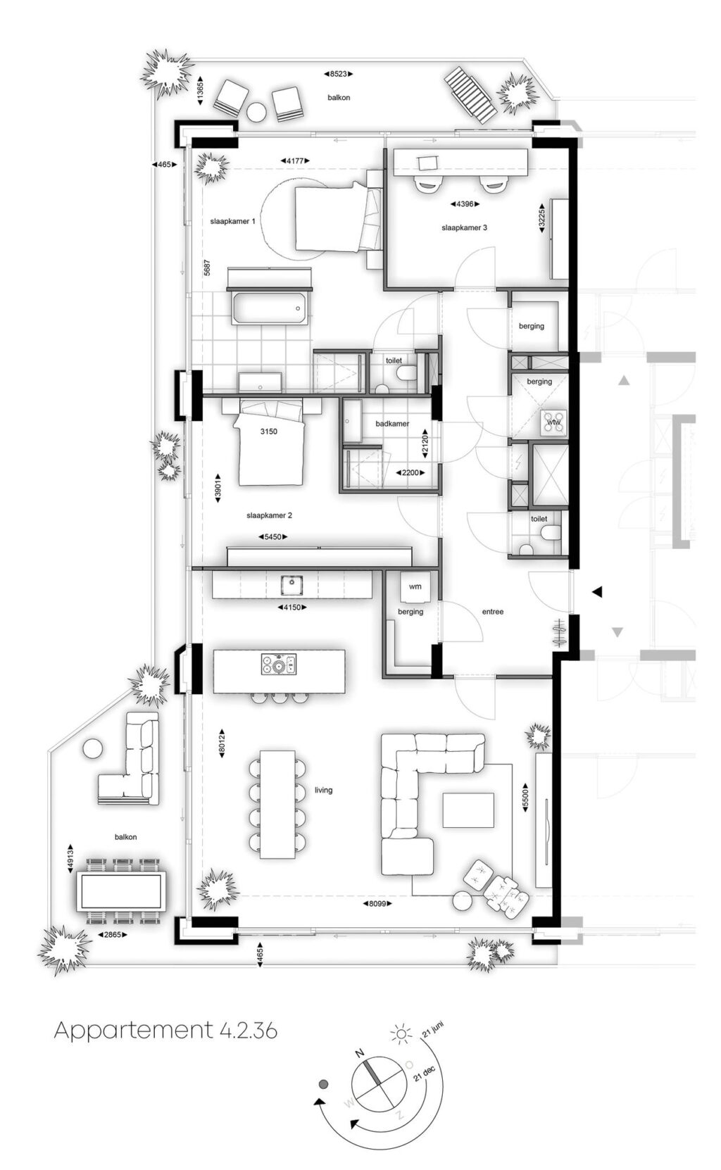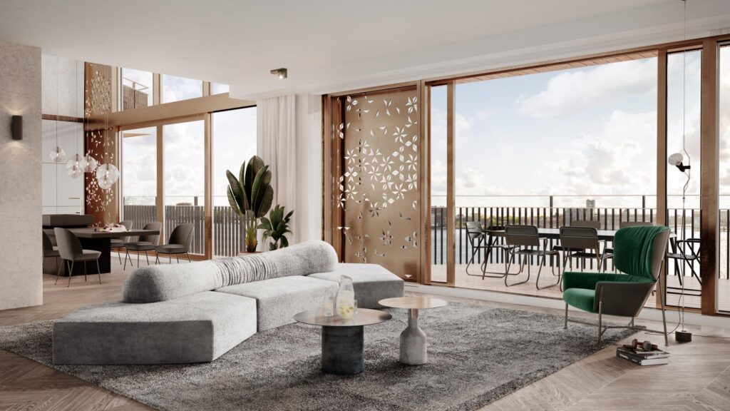 Op de tweede verdieping van Blanc ligt dit appartement van ca 154 m2 met twee ruime terrassen (totale oppervlakte ca 46m2). Het Oeverpark en het IJ liggen hier letterlijk aan uw voeten. De woning heeft drie slaapkamers. De living ligt op de zuidwest hoek, aan beide zijden kunnen de schuifpuien open voor een zomers gevoel. Vanuit de living en vanaf het terras heeft u zicht richting het IJ. De indeling van het appartement kan in overleg naar uw wensen worden aangepast