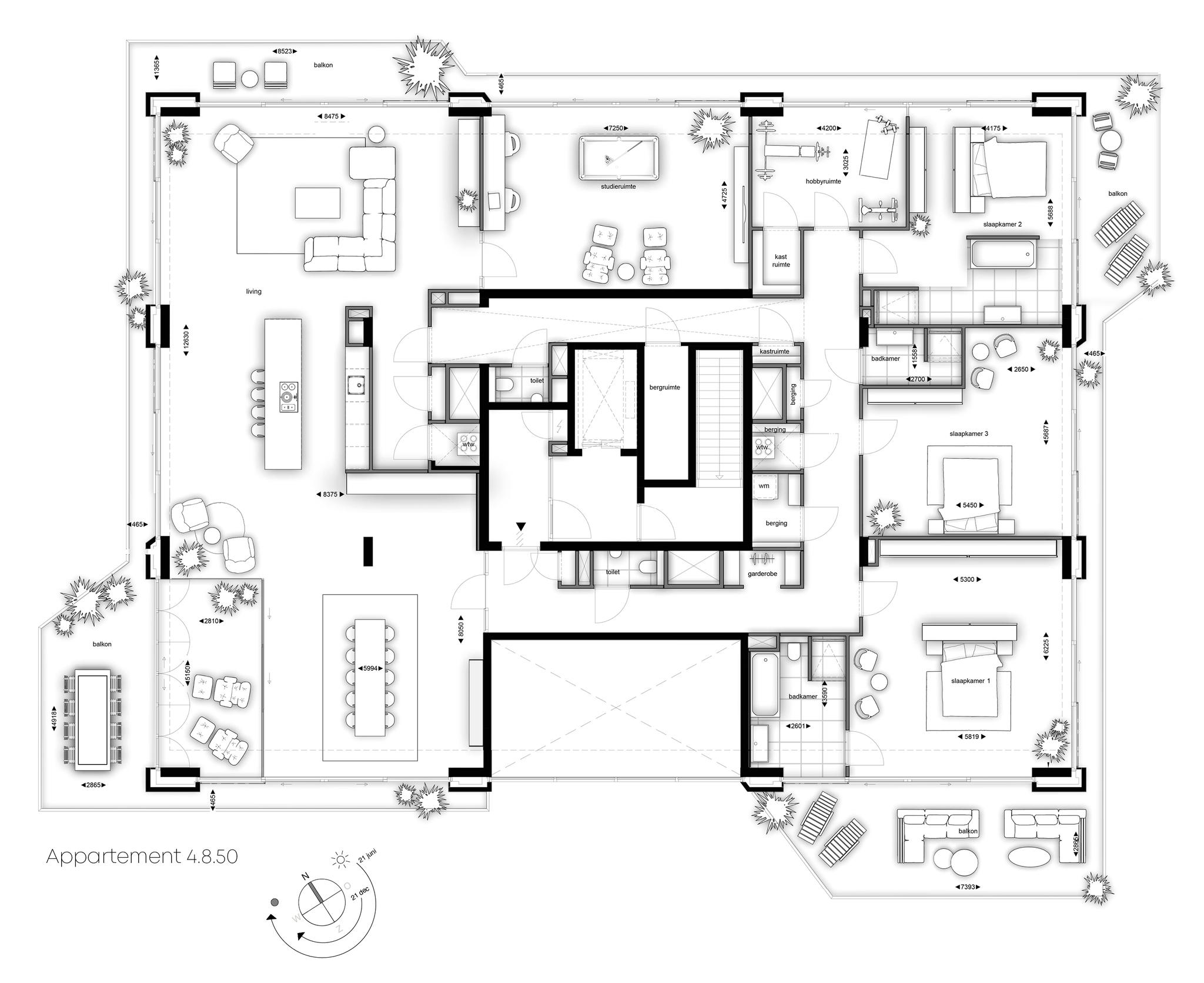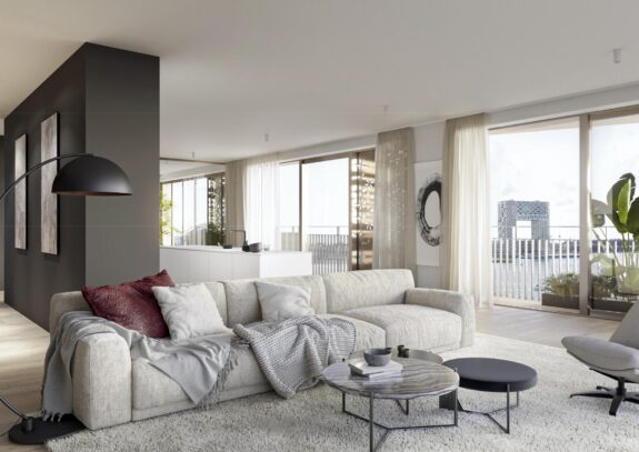 De lift geeft toegang tot de entreehal van het penthouse, dat de totale achtste verdieping bestrijkt. De gehele  zuidwestvleugel reserveerde de architect voor wonen en eten. Een grote en lichte ruimte, die op verschillende manieren is in te delen, met daaraan grenzend twee terrassen. Op de zuidwesthoek creëerden de architecten een serre, grenzend aan het balkon. Een heerlijke plek om te genieten van de zonsondergang, als het buiten net te koud is. Voor het appartement is een keuken ontworpen door Piet Boon Kitchen, met apparatuur van Gaggenau, Bora en Quooker. De keuken kan nog geheel naar eigen wens worden vormgegeven.