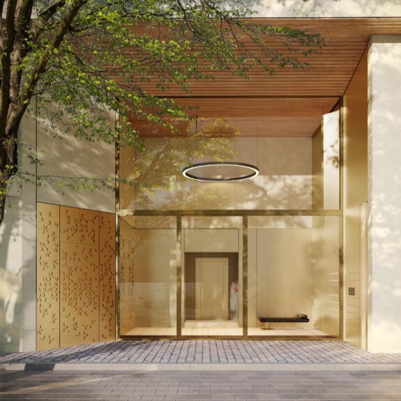 De centrale entree van Blanc is ruim en licht, door het gebruik van extra hoogte en een lichte kleurstelling. De entreegevel ligt iets terug voor beschutting. De wand wordt bekleed met een geperforeerd messingkleuring paneel dat doorloopt van buiten naar binnen. Met een veilige videofoonverbinding kan de bewoner besluiten wie toegang krijgt tot de entree. Hier komt een handige pakketkast van MyPup waar pakketjes kunnen worden afgeleverd. Fysiek aannemen is niet meer nodig en zelfs het retourneren van een pakket kan via de MyPup postkast.