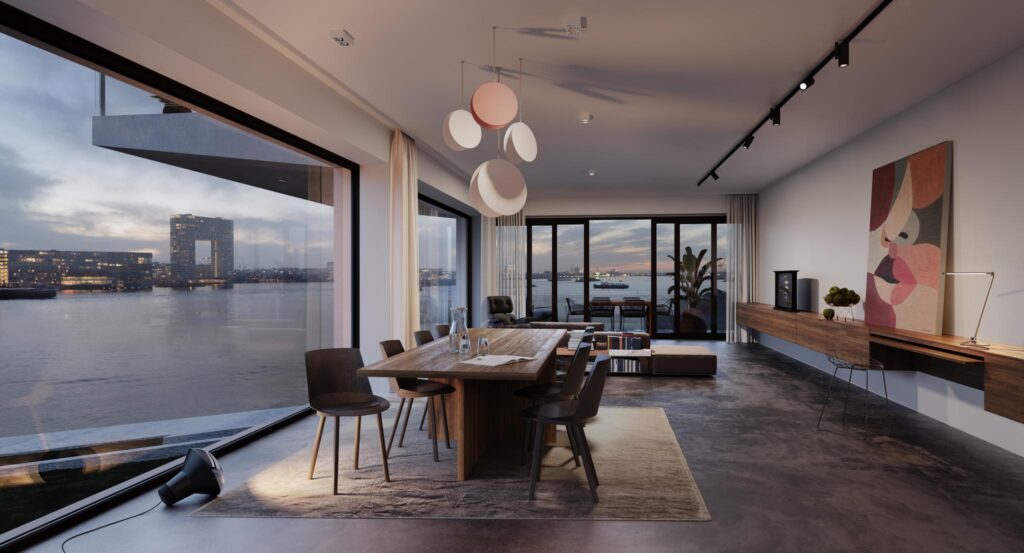 Een uniek appartement op de eerste verdieping over de volle breedte van Horn, van ca. 155 m2. Alle kamers liggen aan de IJ-zijde. Geniet van de ochtendzon op het terras van ca. 8 m2 op het zuidoosten. En aan het eind van de dag genieten op het terras van ca. 19 m2 op het westen met uitzicht over het IJ tot zonsondergang. Met vier slaapkamers en twee badkamers biedt de woning veel ruimte.