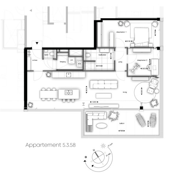 Een slim ingedeeld hoekappartement van ca. 102 m2 op de derde verdieping, met een terras op het zuiden. De living aan de kant van het IJ is meer dan 13 meter. Het heerlijke terras van ca. 19 m2 biedt ruimte om te loungen en lang te tafelen op warme dagen. De twee slaapkamers en de ruime badkamer maken deze woning compleet. De indeling van het appartement kan in overleg naar uw wensen worden aangepast.