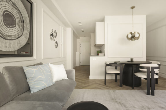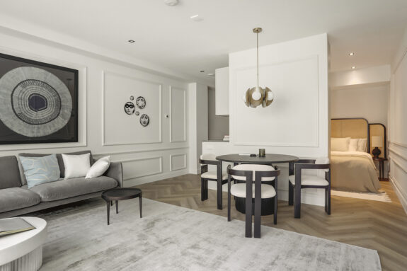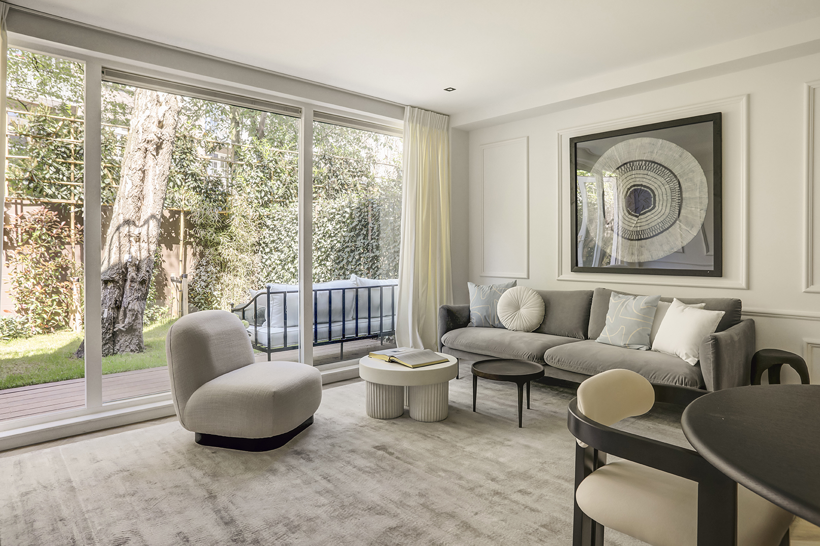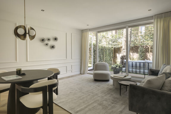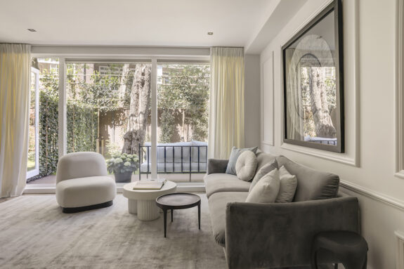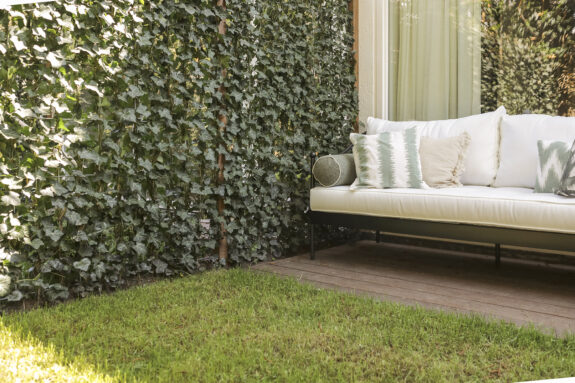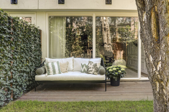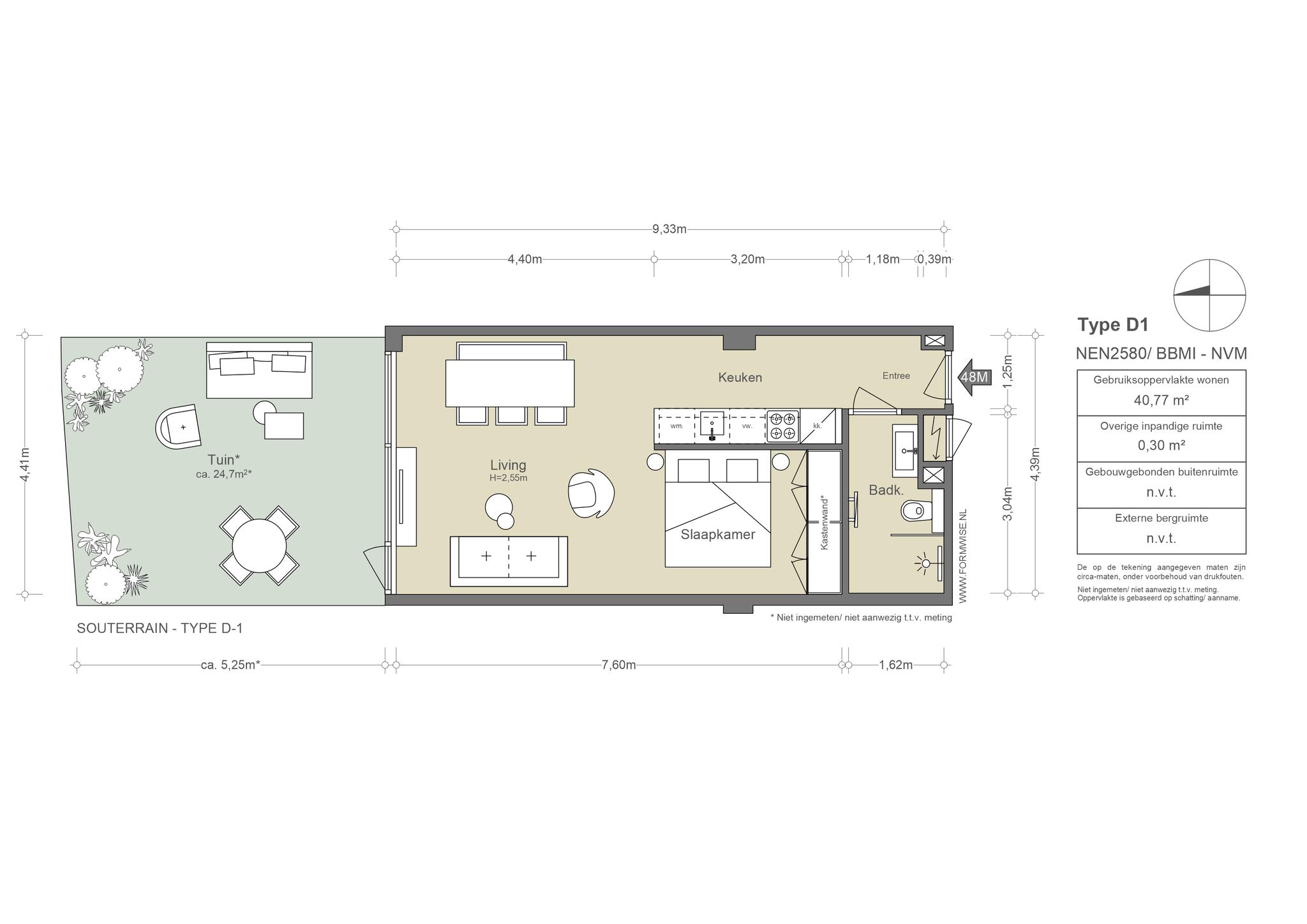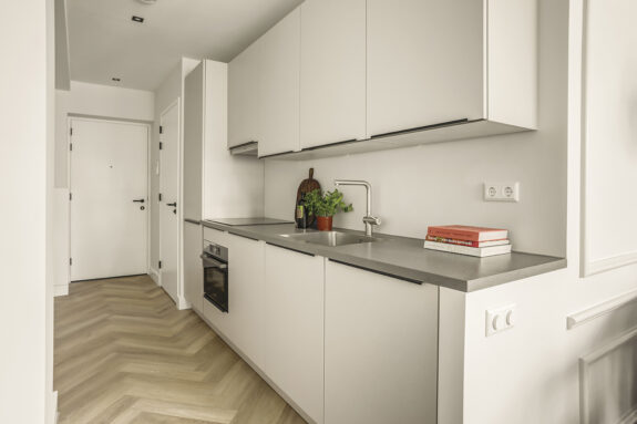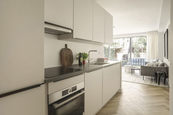 Als we de gang inlopen op de begane grond, vind je aan de rechterkant de zes unieke tuinwoningen. De studio appartementen met huisnummer 48 H, K, L, en M zijn identiek aan oppervlakte en indeling. Deze zijn circa 41 m² groot en hebben een tuin van circa 24 m². De studio’s op de linker- en rechterhoek, respectievelijk 48 N en 48 G, wijken iets af. Studio 48 N is circa 39 m² groot en heeft een tuin van 26 m², 48 G is circa 40 m2 groot en heeft een tuin van circa 17 m2.