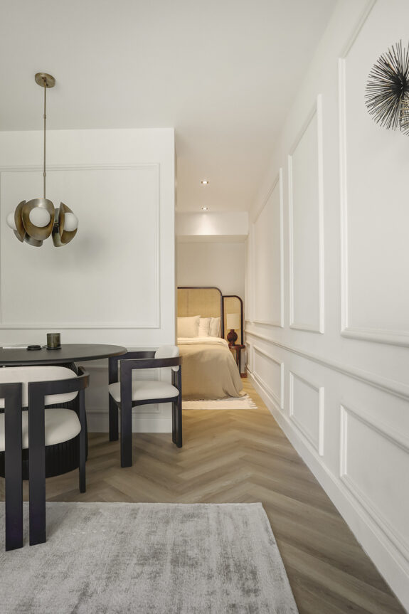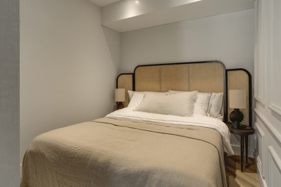 Het slaapgedeelte bevindt zich in een open ruimte en kan gedeeltelijk worden afgescheiden door een slimme kastenwand. Het loft-achtige karakter van de woning geeft het een eigentijdse en speelse uitstraling.