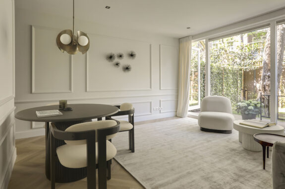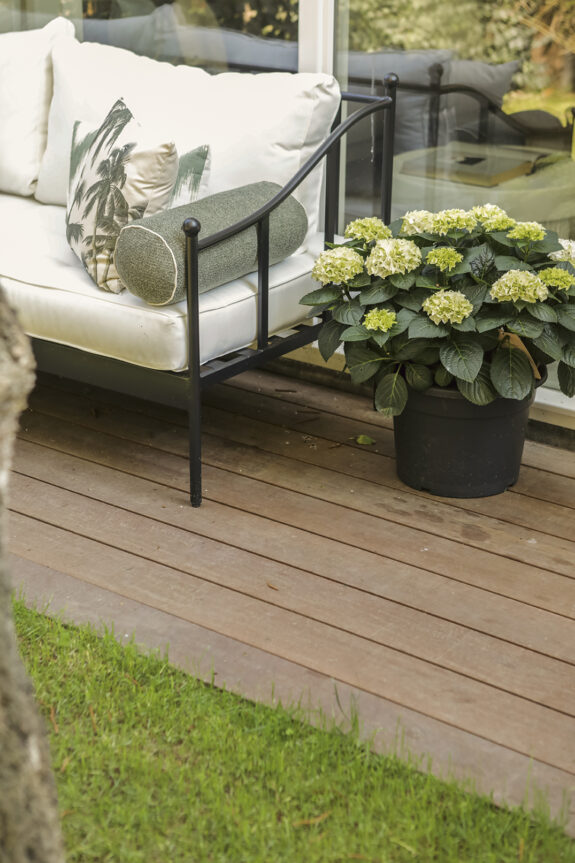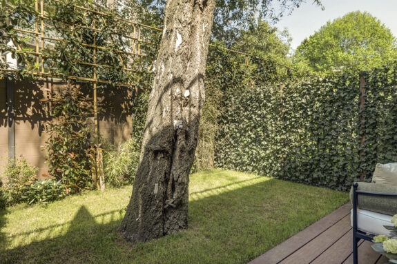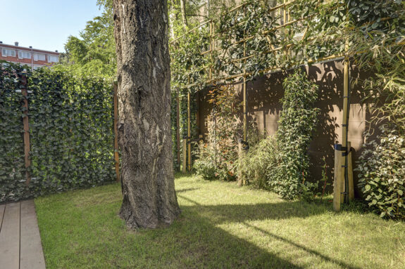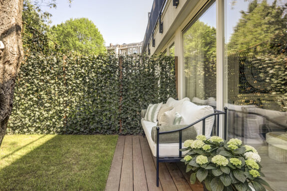 Aan de woonkamer grenst een prachtige tuin die zich uitstrekt over de hele breedte van de woning. De tuin is smaakvol aangelegd en voorzien van een Bankirai terras, echt gras, beplanting en leibomen. De grote ramen verbinden de binnen- en buitenruimte van het huis.