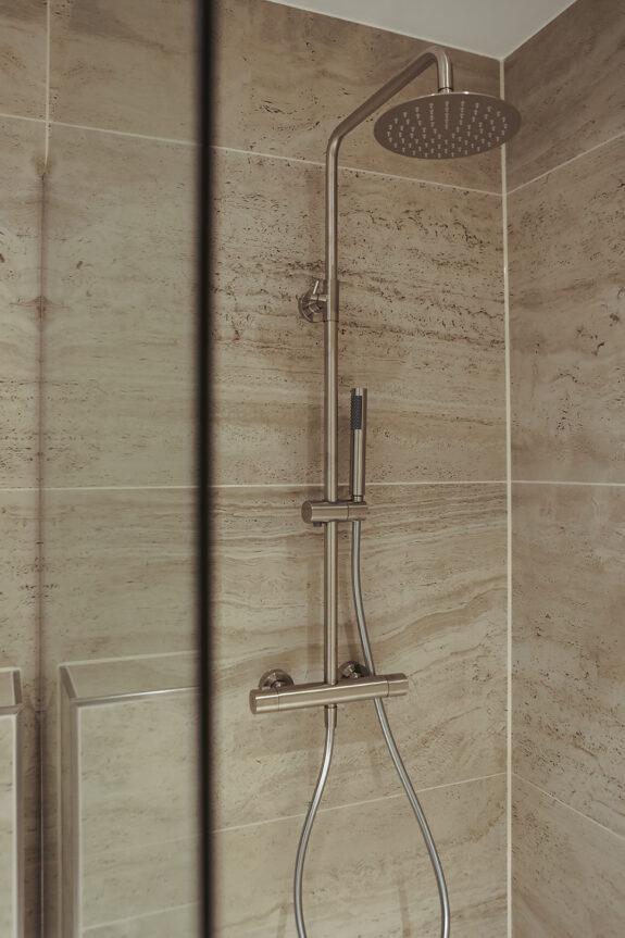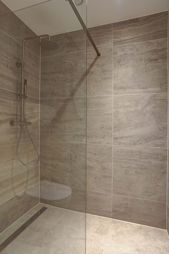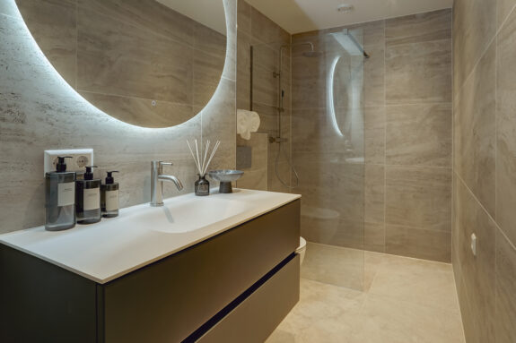De luxe badkamer beschikt over een inloopdouche, een wastafel met een grote ronde verlichte spiegel en een toilet. Het geheel is energiezuinig en voorzien van alle eigenschappen die een modern appartement nodig heeft.