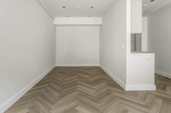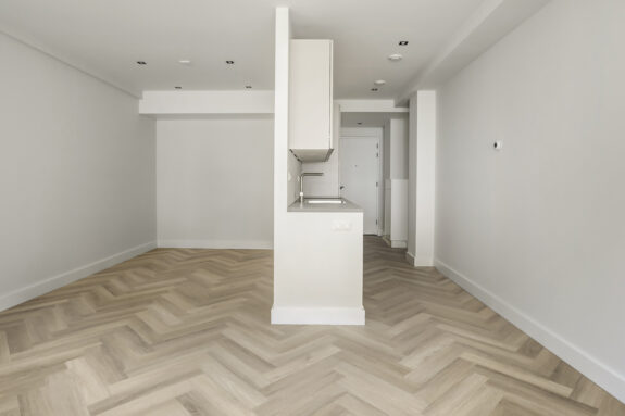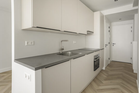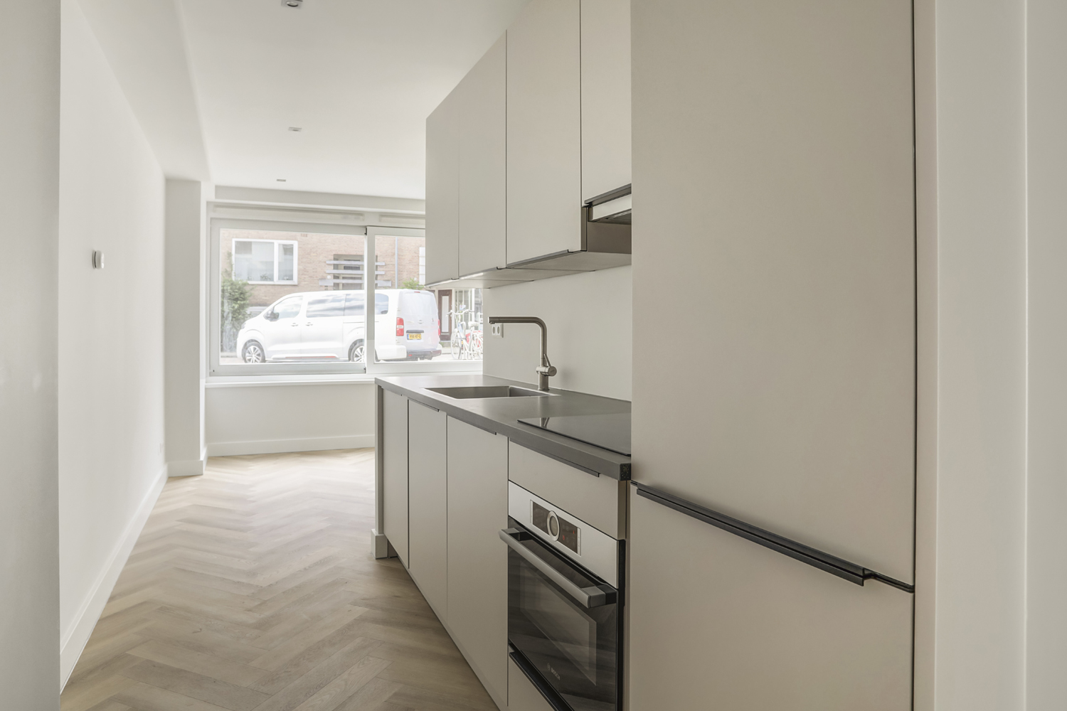 Bij binnenkomst in het appartement tref je een entree met een plek voor een garderobe. De keuken strekt zich uit over de lengte van het appartement en is voorzien van een vaatwasser, was-droog combinatie, inductiekookplaat en ijskast met vriezer.