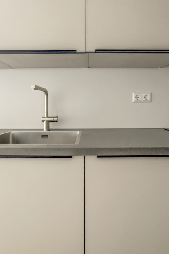 De woonkamer biedt voldoende ruimte voor een zitgedeelte en een eettafel. Als je de grote ramen openschuift, zou je via een trappetje het brede trottoir op kunnen stappen om een koffie te drinken in de zon. Het slaapgedeelte is open en kan gedeeltelijk worden afgescheiden door een slimme kastenwand of kamerscherm.