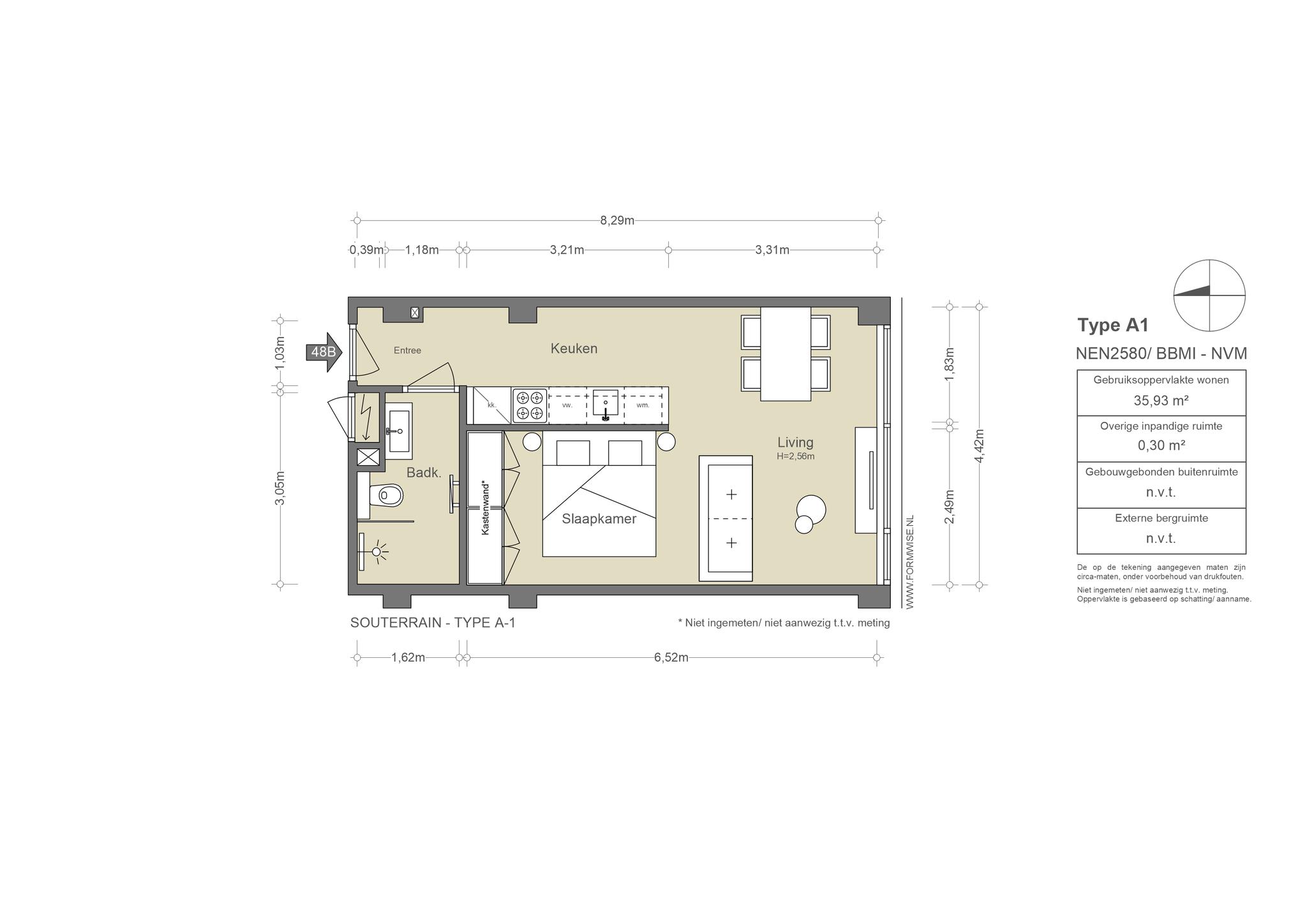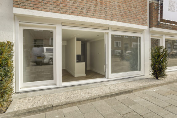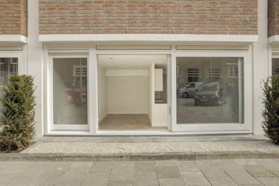 Bij binnenkomst in het gebouw word je begroet door de verzorgde entree in de centrale hal, welke toegang biedt tot de woningen op de begane grond. Aan de linkerzijde van de gang bereik je de studio appartementen 48 A t/m F met levendig uitzicht op de straat. Studio 48 D is extra licht, deze bevindt zich op de hoek en heeft een extra raam aan de lange wand.