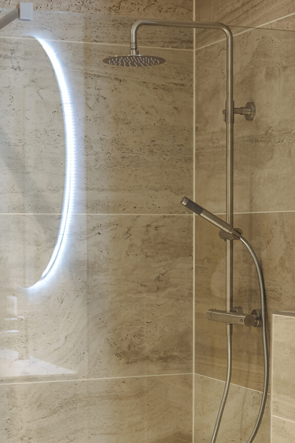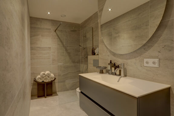 De badkamer is ruim opgezet en beschikt over een toilet, brede wastafel met een verlichte spiegel en inloopdouche.