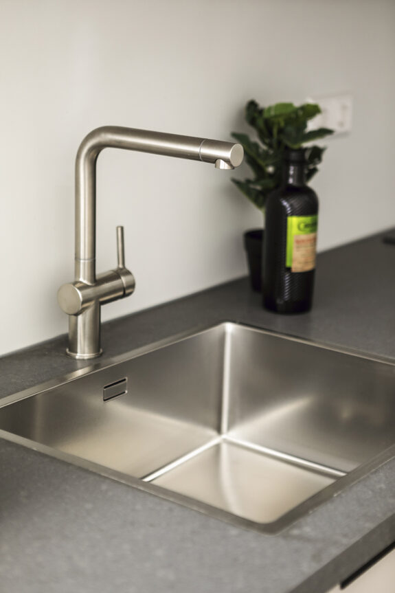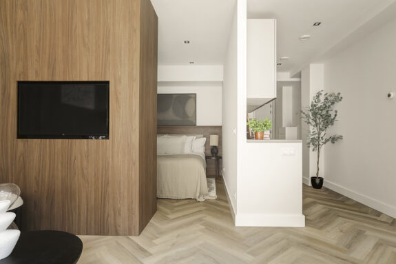 De woonkamer biedt voldoende ruimte voor een zitgedeelte en een eettafel. Als je de grote ramen openschuift, zou je via een trappetje het brede trottoir op kunnen stappen om een koffie te drinken in de zon. Het slaapgedeelte is open en kan gedeeltelijk worden afgescheiden door een slimme kastenwand of kamerscherm. De badkamer is ruim opgezet en beschikt over een toilet, brede wastafel met een verlichte spiegel en inloopdouche.