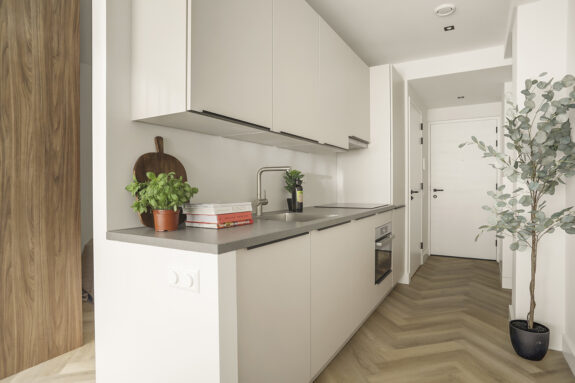 Bij binnenkomst in het appartement tref je een entree met een plek voor een garderobe. De keuken strekt zich uit over de lengte van het appartement en is voorzien van een vaatwasser, was-droog combinatie, inductiekookplaat en ijskast met vriezer.