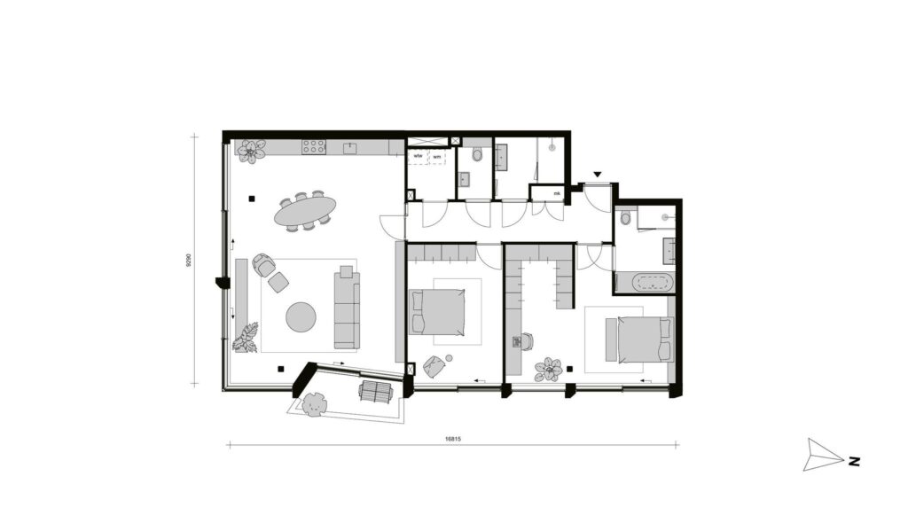 U bereikt dit 3-kamer appartement met de lift of de trap in de gemeenschappelijke entree. In de entreehal is het toilet en daarna komt u binnen in de ruime hal die toegang biedt tot alle ruimtes van het appartement: allereerst de badkamer, die is voorzien van douche en wastafel, en de beide slaapkamers. Een daarvan heeft een eigen badkamer, voorzien van 2e toilet, douche, wastafel én ligbad! De ruime woonkamer met open keuken heeft aan de voorzijde een klein balkon op het zuidwesten. Dat is lekker!