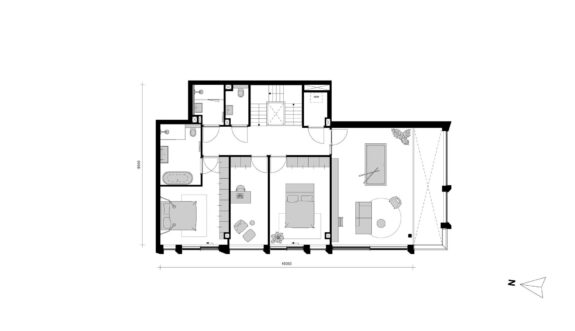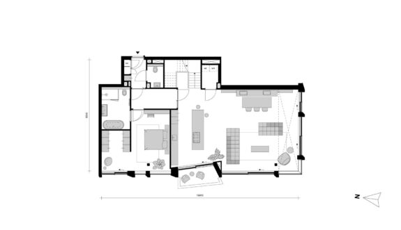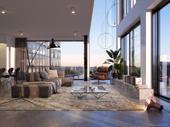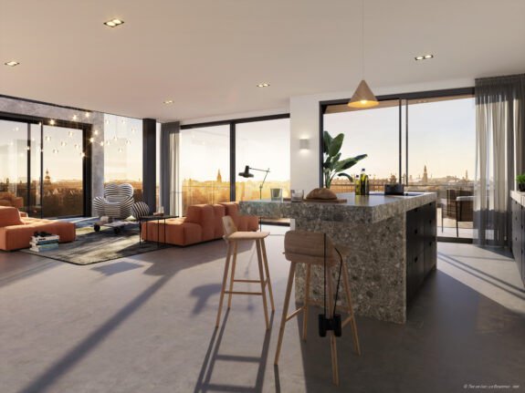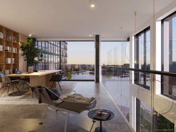 De entreehal biedt toegang tot de centrale hal van het appartement, waar ruimte is voor inbouwkasten. Hier zijn deuren naar de woonkamer en de slaapkamer waar een inloopkast kan worden gecreëerd en een privé badkamer. De woonkamer met open keuken is heerlijk licht en grenst aan het balkon op het westen. Na een lange werkdag geniet je hier nog even lekker van de zon. De vide over de breedte van de woonkamer zorgt voor een extra gevoel van ruimte. De gehele zuid- en westgevel in de woonkamer bestaan uit glazen schuifpuien, voor heel veel licht in huis en een prachtig wijds uitzicht over het water van het Oosterdok met daarachter monumentaal Amsterdam.