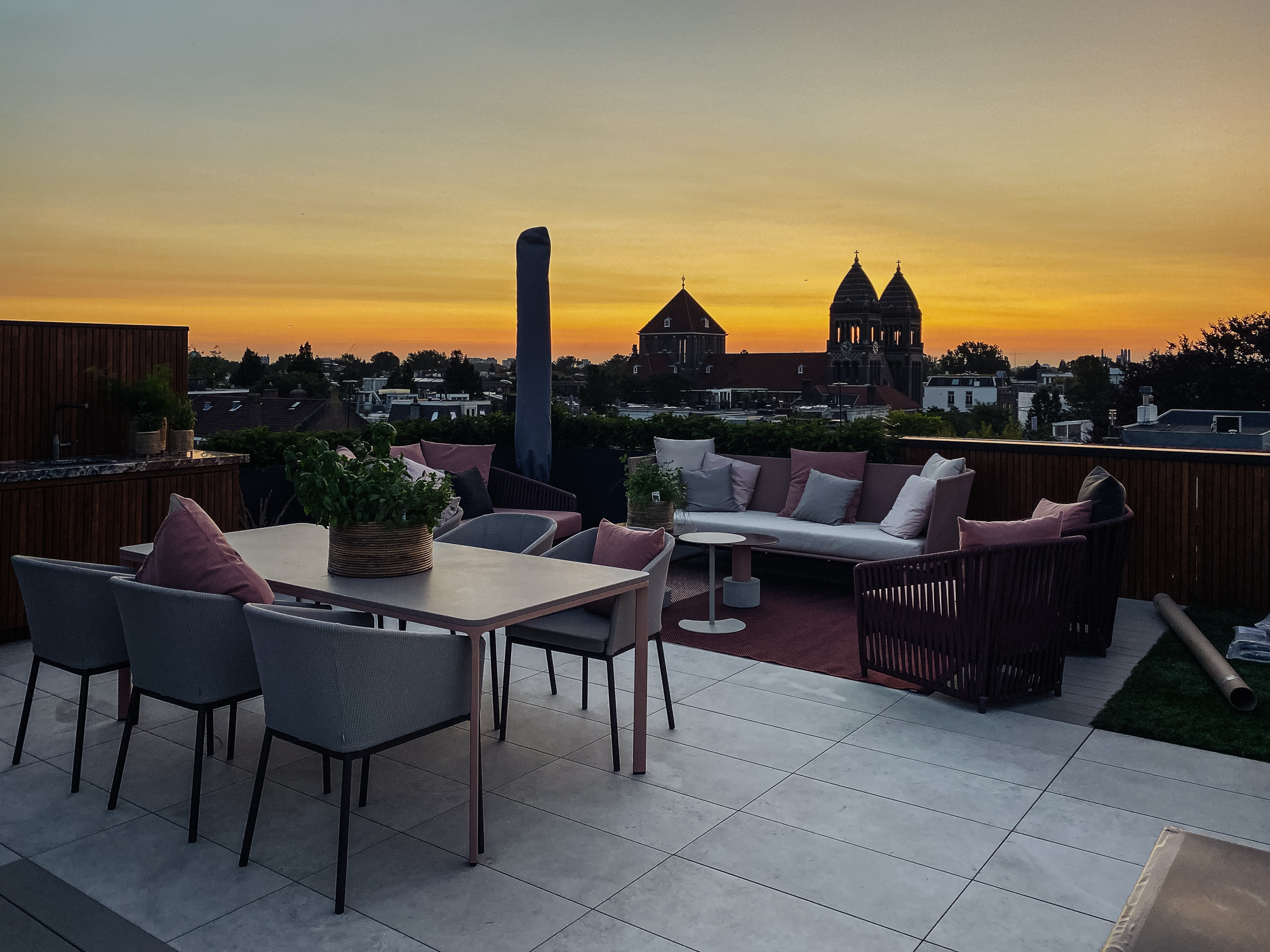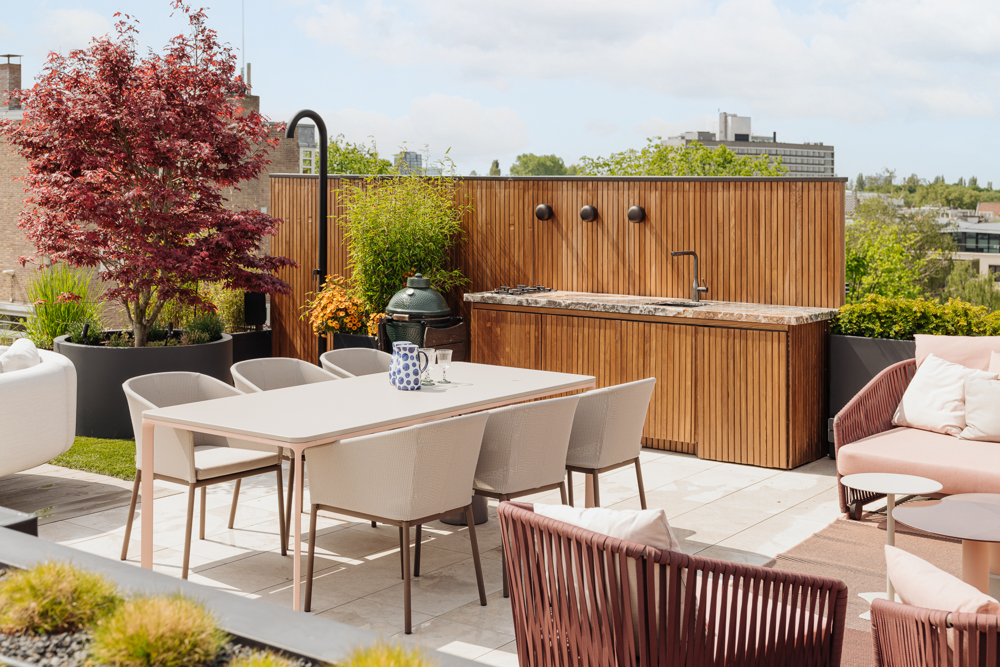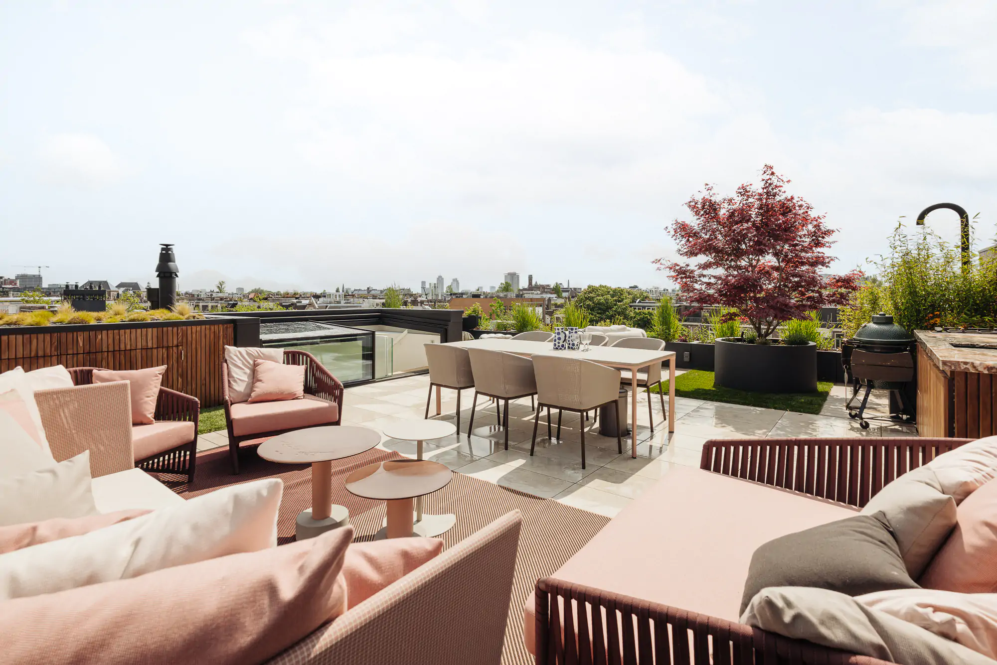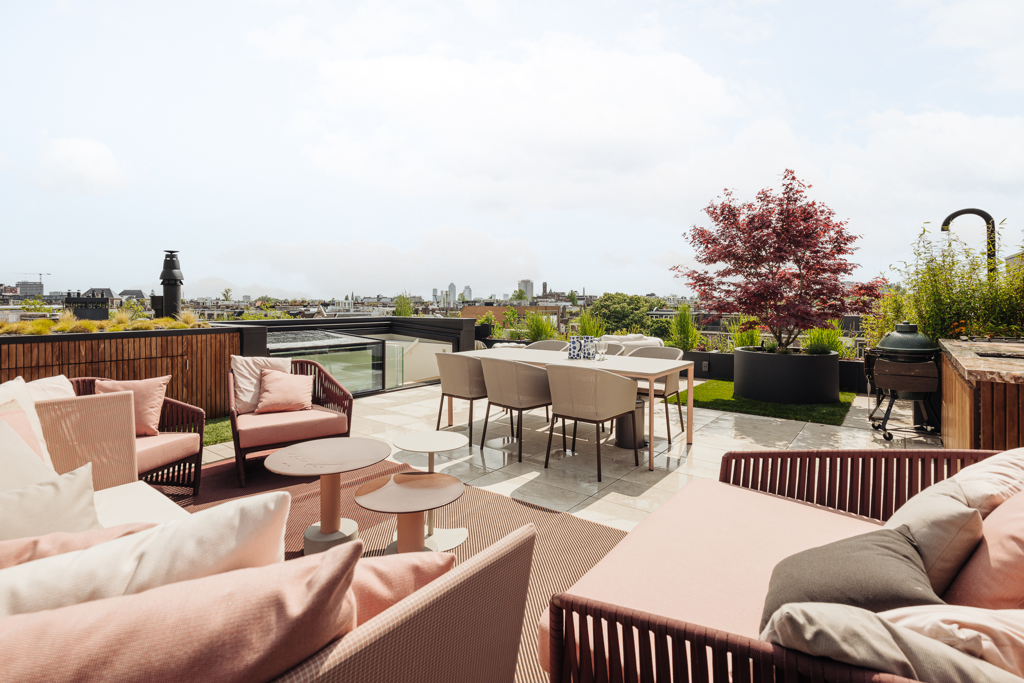 ‘Op deze vijfde verdieping is één van de mooiste daktuinen van Amsterdam. De tuin van 66 m2 biedt volop privacy en heeft vrij zicht aan vier zijdes.