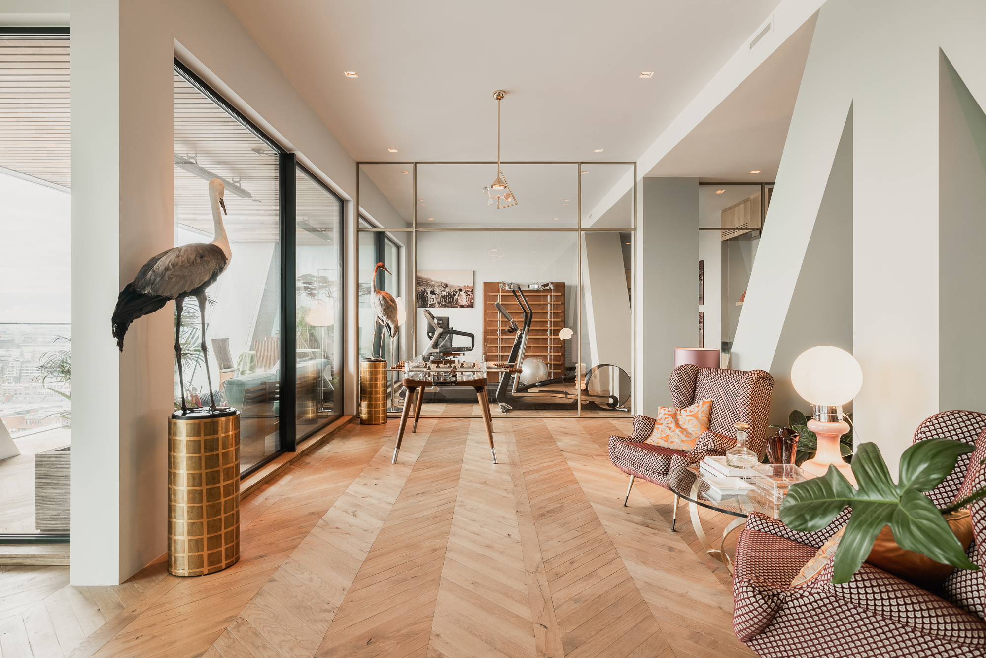 “Ik hou van de oorspronkelijkheid en geschiedenis van vintage stoffen en meubels. Het leeft. Zo ben ik ook te werk gegaan in dit huis. Neem nou bijvoorbeeld de vloer. Ik wilde iets huiselijks hebben, de warmte, maar ook iets waarop ieder interieur zou passen. De vloer moet letterlijk ondergeschikt zijn. Ik heb gekozen voor een eiken vloer in een Hongaarse punt, maar niet op de traditionele manier. De inspiratie komt van appartementen in Parijs. Wanneer daar tijdens een verbouwing met de sloop van wanden en muren werd begonnen werd er op die plek, om de vloer bij elkaar te houden, een verticale lat gelegd. Dat heb ik hier ook toegepast waardoor de vloer minder één richting krijgt, maar er leven is toegevoegd. De vloer in de loggia is van teak en in dezelfde punt gelegd. Door de vloer in de olie te zetten krijgt hij dezelfde kleur als de vloer binnen en zo loopt optisch binnen en buiten in elkaar over. Het appartement op de negentiende verdieping was oorspronkelijk ingetekend met gangen en muren. Ik wilde gebruik maken van zowel het licht aan de voorkant als aan de achterkant dus ik heb de lay-out aangepast. Ik ben begonnen om de keuken centraal in het midden te zetten.”
