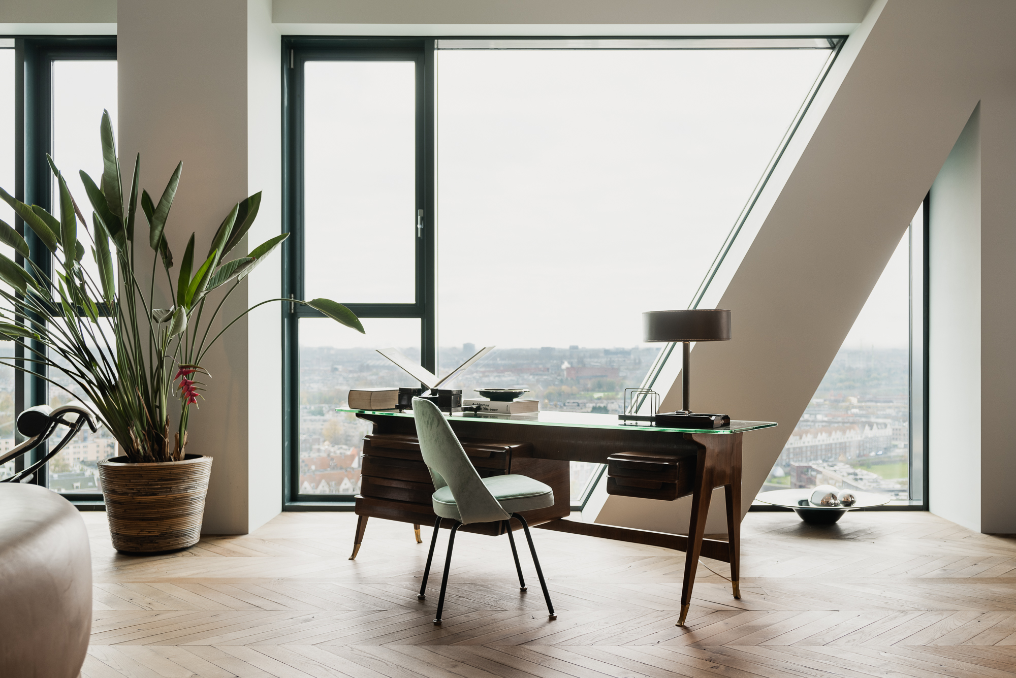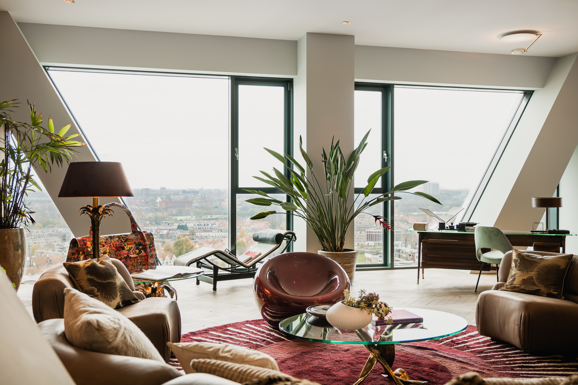 Eclectisch wonen op ruim 300 vierkante meter op de negentiende verdieping van het Pontsteiger gebouw aan het IJ. Anja Henneman, voormalig topmodel, ontwierp het interieur en richtte het in met bijzondere vintage meubels uit de hele wereld.