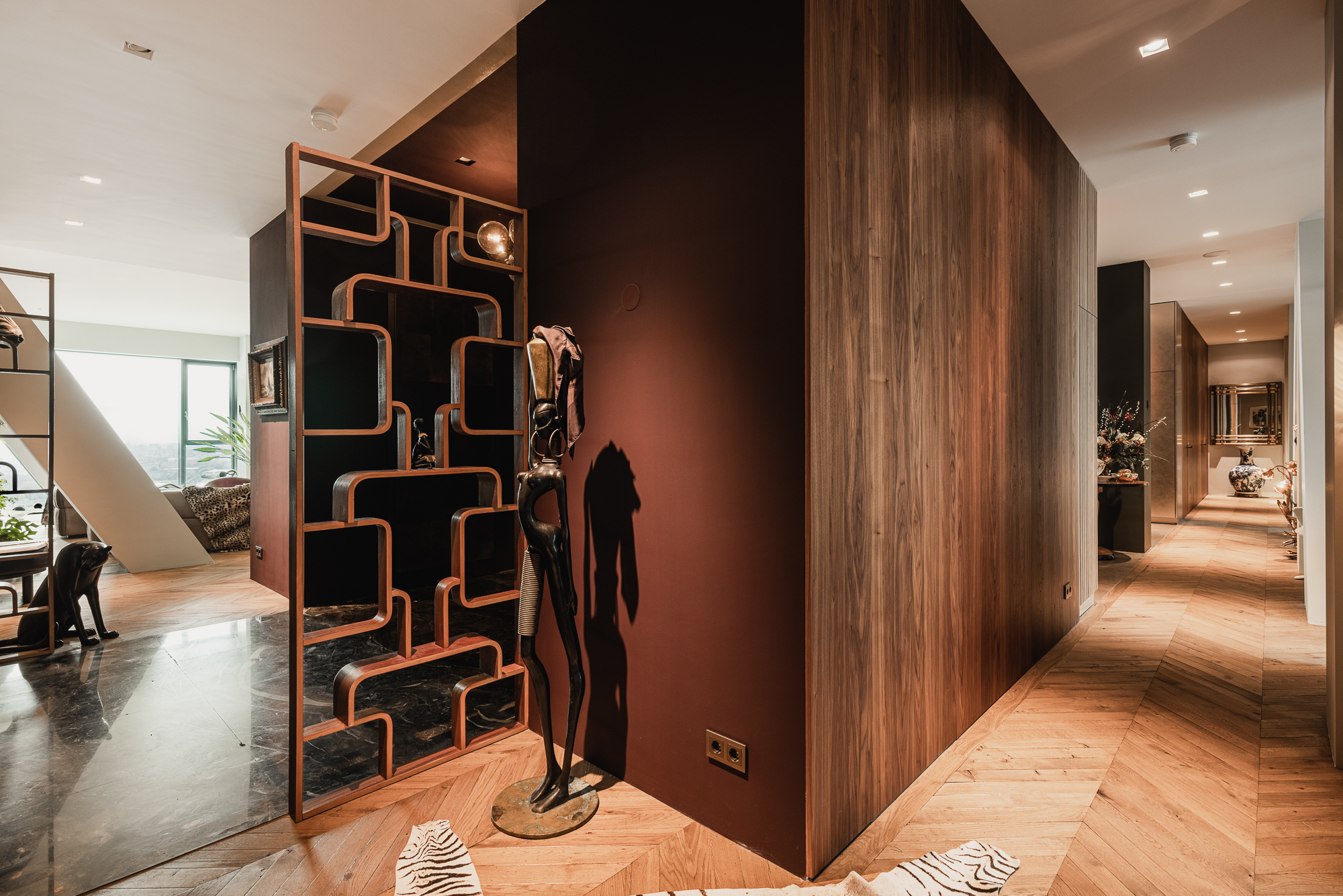 “De stijl hier lijkt een allegaartje, maar als je goed kijkt dan zie je dat verschillende details consequent worden herhaald. De pootjes van de stoelen in de zithoek zijn bijvoorbeeld afgestemd op de poten van het bureau en het dressoir. Ik heb een appartement willen ontwerpen wat internationale allure uitstraalt. Eigenlijk moet het in elke stad kunnen staan. Het appartement is voor 95% ingericht met vintage items. Het was een uitdaging om meubels van verschillende ontwerpers met elkaar te mixen. Ik heb uiteindelijk gekozen voor ontwerpen van meerdere ontwerpers uit dezelfde periode. Door hetzelfde kleurgebruik (mode) uit die tijd combineert het verrassend goed.”