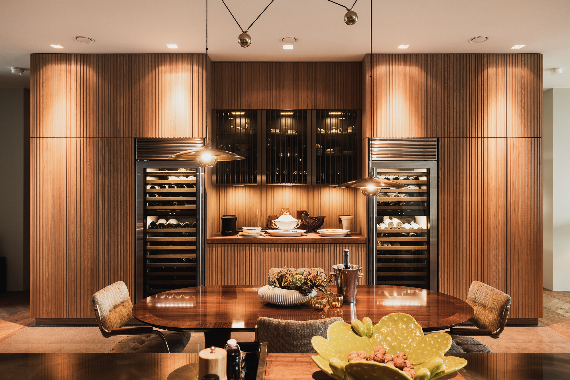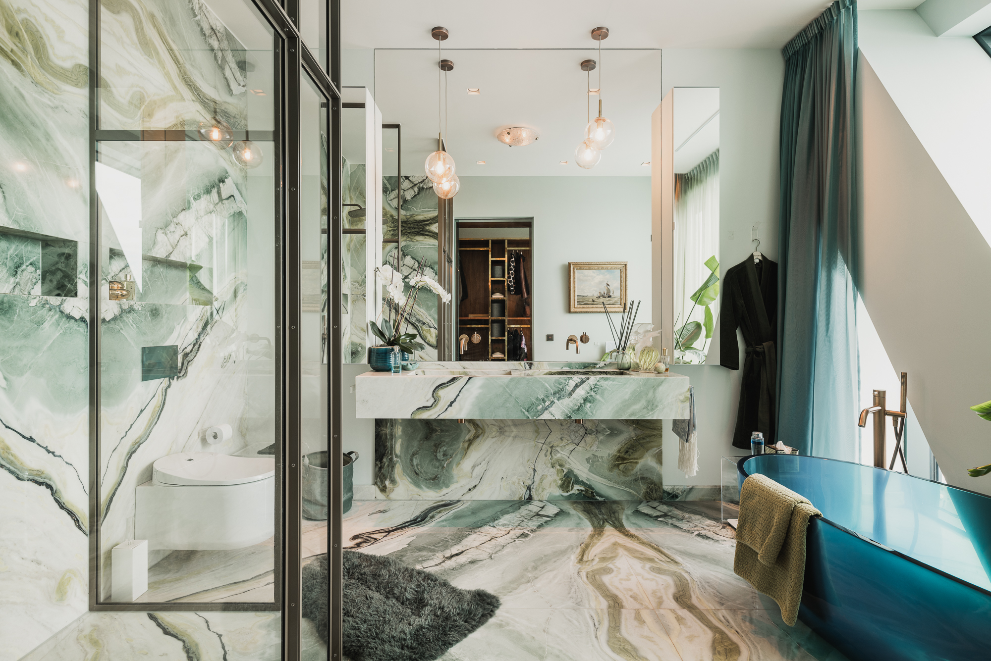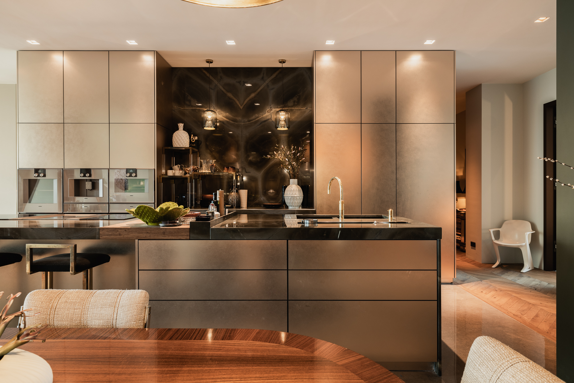 “Het dressoir en het bureau zijn van de hand van ontwerper Orsvaldo Borsani die deze ontwierp voor zijn eigen bedrijf Tecno eind jaren vijftig. Het ontwerp van het enorme ronde vloerkleed uit de jaren 40 is van een architect. De bank is één van de eerste exemplaren die uit losse elementen bestaat. Het verzilverde reuze formaat Dollar biljet aan de muur is van kunstenaar John Breed uit Egmond aan Zee. De kamerschermen komen uit het voormalig Oostblok. Lampen van o.a Maison Bagues en Hans Kögl. Het marmer in de badkamers komt uit Brazilië en is opengevouwen als een boek waardoor de vlammen symmetrisch zijn. De kleuren van de muren in de slaapkamer , badkamer maar ook van de verschillende gordijnen zijn allemaal net een tintje anders. De banken en stoelen in de bioscoop zijn van Casina en zijn allemaal qua vorm aan te passen. De glamour uit de jaren’50 heb ik altijd heel fijn gevonden . Er werden zo vlak na de oorlog veel sierlijke en praktische producten gemaakt. Ik houd van nuttig en elegant en vooral van producten die mooi gemaakt zijn. Echt ambachtelijk daar geniet ik van. Daarnaast vind ik het leuk om deze te combineren met een beetje gekke bijzondere objecten, zoals de metalen Kelly bag, ooit gestaan in de etalage van Hermès, aan Rue de Faubourg.”