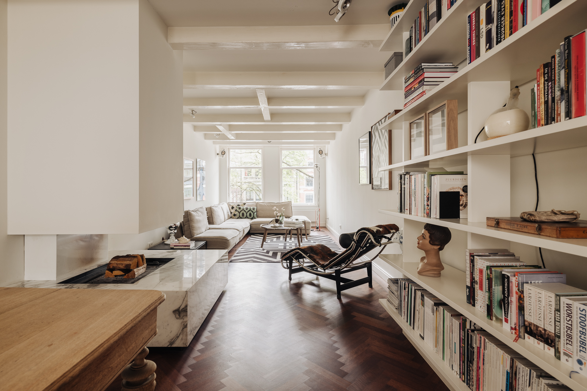 "Aan de grachtzijde is de smaakvolle living met fraai zicht op de gracht en open haard."