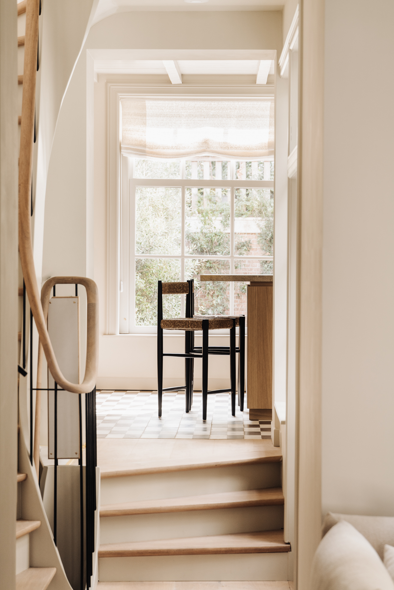 Het huis heeft twee toegangen, elk bereikbaar via enkele treden vanaf de straat. De hoofdentree op het bordes leidt naar een ruime hal met een prachtig afgewerkte tegelvloer.